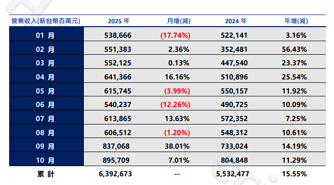 AI热潮继续扮演增长引擎角色,鸿海10月营收数据表现亮眼,创下多项历史纪录。 11月5日,作为英伟达最大服务器制造商和苹果顶级iPhone组装商,鸿海最新公布的业绩报告显示,AI 服务器业务成为增长引擎,10月营收不仅创下历史同期纪录,更创下公司成立以来的单月最高纪录(历 年同期次高为2024年10月营收8048亿;历年单月次高为2025年9月营收 8370 亿)。 财务表现: 10月营收达到8957亿,超越9月的8370亿,也远高于去年同期的8048亿,月增7.01%,年增 11.29%(美元计价年增15.4%); 前10月累计营收6.39万亿新台币,年增15.55%(美元计价年增17.9%),同样创历史同期新 高。 | 營業收入(新台幣百萬元) | 2025 年 | 月增(減) | 2024 年 | 年增(減) | | --- | --- | --- | --- | --- | | 01 月 | 538,666 | (17.74%) | 522,141 | 3.16% | | 02 月 | 551,383 | 2.36% | 352,481 | 56.43% | | 03 月 | 552,125 | 0. ...