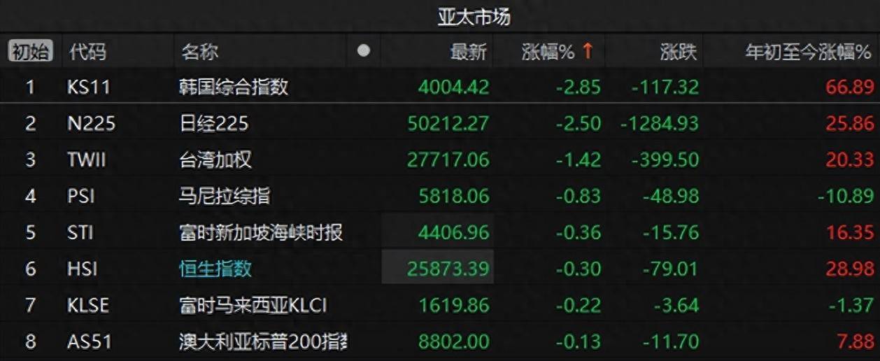 美股科技股本来就出现颓势,再加上金融市场流动性紧张、"AI泡沫轮"叙事盛行、迈克尔·伯里做空英伟达等多重因素影响,昨晚纳指大跌超2%,英伟达大 跌近4%,整个AI线全线下挫。 美股AI泡沫恐慌情绪蔓延,今天日韩股市开盘同样暴跌,日经225一度暴跌近5%,韩国综合指数一度暴跌超6%,韩国股市程序化交易卖单一度被暂停5分 钟,可能这就是牛市多暴跌。 | | | 亚大市场 | | | | | | | --- | --- | --- | --- | --- | --- | --- | --- | | 初始 代码 | | 名称 | 0 | 最新 | 涨幅% ↑ | 涨跌 | 年 | | 1 | KS11 | 韩国综合指数 | | 4004.42 | -2.85 | -117.32 | | | 2 | N225 | 日经225 | | 50212.27 | -2.50 | -1284.93 | | | 3 | TWII | 台湾加权 | | 27717.06 | -1.42 | -399.50 | | | 4 | bsl | 马尼拉拿指 | | 5818.06 | -0.83 | -48.98 | | | ഗ | STI ...