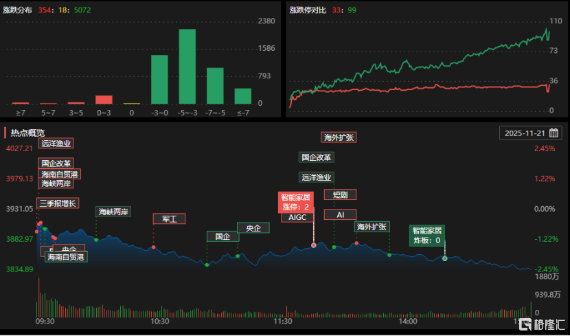 11月21日,沪指跌2.45%,深成指跌3.41%,创业板指跌4.02%。全市场5100股下跌,其中近百股跌停。中船系、AI应用板块活跃,电池、硅能源、锂矿等板 块跌幅居前。 焦点股方面,水产股中水渔业6连板、獐子岛3天2板,AI应用概念股榕基软件5连板、实达集团2连板,华瓷股份上演"准地天"行情走出6天5板。 | 代码 | 名称 | 价格 | 涨跌 | 涨幅� | 换手% 几天几板[2 ... | 成交额 | 成交量 涨停分析 | | --- | --- | --- | --- | --- | --- | --- | --- | | 688622 | 未信仪器 | 117.60 +19.60 | | +20.00% | 6.23% 自板涨停 | 4.847 | 43880 量子计算+并账 | | 688227 | 品高反分 | 49.02 | +8.17 | +20.00% | 2.46% 自板涨停 | 1.36 7. | 27790 拟增资江原+A | | 301171 | 易点天下 | 39.97 | +6.66 | +19.99% | 38.15% 首板涨停 | 55.40 Z. | AIGC++ 海 ...