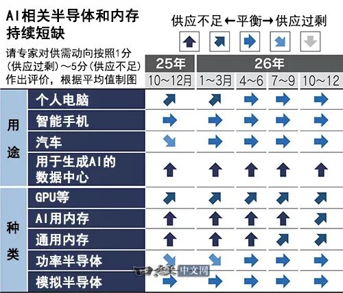 2026年半导体供需与市场展望 - 专家一致认为2026年AI用半导体将出现供应不足[2][4] - 世界半导体贸易统计组织预测2026年全球半导体市场规模将同比增长26%至9754亿美元[8] - 目前存在对AI数据中心过度投资及电力短缺的担忧 一旦AI需求生变可能打乱供需规律[8] AI用半导体供需状况 - AI计算用的图像处理半导体生产线将持续满负荷运转 最尖端的2-3纳米产品供应尤其难以跟上需求[5] - 用于临时存储GPU计算结果的高带宽存储器生产也跟不上需求 美光科技2026年产量已全部签约完毕[5] - HBM属于DRAM的一种 其需求旺盛推动了相关企业股价上涨[4] 存储器市场动态 - 数据中心用内存价格上涨是推动三星电子2025年10-12月季度营业利润激增至上年同期3.1倍的主要因素[4] - 2025年10-12月 DRAM价格环比上涨50-55% NAND价格环比上涨33-38%[4] - 2026年上半年DRAM价格预计继续上涨 NAND价格也将因数据中心存储设备需求高涨而呈现上涨态势[7] - 铠侠控股、SK海力士及美光科技等内存厂商股价在2025年底至2026年初均出现显著上涨[4] 通用存储器及下游影响 - 受AI产品生产优先影响 用于智能手机和个人电脑的通用存储器也出现短缺[2][7] - 存储器短缺和价格上涨可能影响智能手机和个人电脑的整体出货量[7] - 低价位智能手机可能无法消化存储器涨价成本 销量或被下调[7] - 2026年下半年可能面临成熟制程半导体市场行情走弱的风险[7] 其他半导体领域 - 业内普遍认为车载半导体将保持温和复苏态势 但在复苏力度上存在分歧[7] - 电压控制用功率半导体等产品自2026年1-3月前后起 供应短缺和价格上涨风险可能逐步显现[7] - 为降低数据中心耗电量而采用相关产品的情况开始增加[7]