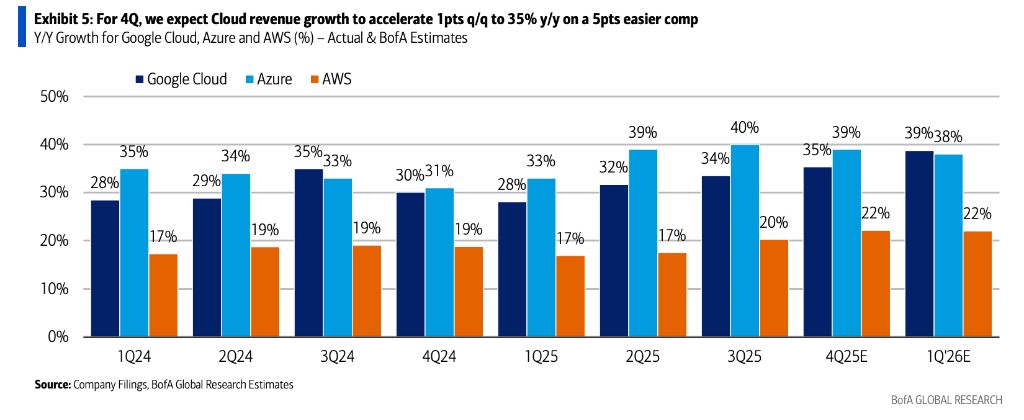 核心观点 - 美银证券预计Alphabet第四季度营收与每股收益将双双超过市场普遍预期 核心驱动因素包括稳定的数字广告市场以及AI驱动下搜索与YouTube业务的强劲增长 [1] - 2026年资本开支预期被大幅上调至1390亿美元 显著高于市场预期 这将成为本次财报的关键变量 主要反映公司在AI基础设施和云业务上的加速投资 [1][10] 四季度业绩预期 - **整体财务预测**:四季度营收预期上调至959亿美元 高于市场预期的952亿美元 每股收益预期上调至2.65美元 略高于市场预期的2.64美元 [1] - **搜索业务**:营收预期上调至619亿美元 同比增长15% 增速预计将高于市场预期的13% 主要受益于Gemini 3发布后使用量加速以及AI驱动工具(如Performance Max)提升转化率 [1][2][5] - **YouTube业务**:广告营收预期上调至120亿美元 同比增长15% 增速预计为14%-15% 高于市场预期的13% 增长主要由效果广告支出推动 生成式AI创意工具降低了广告制作门槛 [1][2][5] - **云业务**:营收预期维持在162亿美元 同比增长35% [2] - **其他收入**:预期由8亿美元上调至13亿美元 主要反映持有的SpaceX及Anthropic等非上市公司股权公允价值重估可能带来的收益 [9] 成本与利润率 - **运营费用**:预计为280亿美元 同比增长13% 但低于市场预期的287亿美元 [1][6] - **运营利润率**:预计同比提升119个基点至39.1% 环比扩张344个基点 核心服务利润率预计同比提升99个基点至40.0% [6] - **成本结构**:当季折旧费用预计为63亿美元 同比大幅增长49% 环比上升7% 若剔除折旧与摊销影响 四季度费用基数同比增幅仅为5.3% [6] - **成本管控**:招聘数据显示公司持续实行严格的成本管控 季度平均职位空缺数环比下降7% 市场普遍预期四季度员工人数环比增加约900人 同比增幅为4% [6] 资本开支与现金流 - **2026年资本开支指引**:预期被上调14%至1390亿美元 同比增长约50% 预计占净营收比重达35% 显著高于市场当前预期的1190亿美元 此上调主要受Meta大幅上调资本开支指引的推动 [1][10] - **四季度资本开支**:预计单季将达292亿美元 环比增长22% 同比增长105% [12] - **自由现金流**:四季度预计为117亿美元 同比下降53% 占净营收的12% [12] - **资本配置与效率**:尽管资本开支强度提升 但公司在AI领域的广泛布局及云业务的扩张需求使其资本配置效率仍被认为优于同业 内部AI能力依托TPU体系可能形成一定的成本优势 [12] - **历史指引与投向**:公司此前已将2025年全年资本开支预期区间上调至910亿-930亿美元 资本支出主要集中于技术基础设施 其中约60%投入服务器 其余40%用于数据中心及网络设备 [12] 未来业务展望 - **搜索业务潜力**:随着AI原生格式在Google搜索中的渗透率提升 市场可能低估了2026年搜索业务的增长潜力 上行空间有望通过更高的用户参与度、转化率改善及新增货币化机会实现 [13][14] - **云业务动力**:Gemini 3.0与TPU的协同效应正逐步构建Google产品的差异化优势 或将推动新的大型合同签约 [14] - **增长与估值**:考虑到公司预计将保持两位数营收增长、云业务利润率持续扩张 并具备高效利用其强大AI资产的能力 当前以2027年预期盈利计算的27倍市盈率被认为相比其历史平均22倍市盈率具备合理性 [14][16]