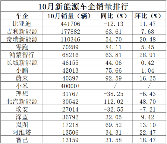 蔚来高管在微博上透露表示, 11月,全新ES8交付将进一步加速,产能较10月预计将有70%的提升。12月,公司将力争进一步提升产能,在15000 台的基础上争取更多的交付。 小米汽车则宣布, 2025年10月,小米汽车交付量持续超过40000台。小米此前公布的数据显示,其9月交付量已经超过40000台。 截至目前统计的 16家汽车公司销量数据中,75%的公司在刚刚过去的十月实现了同环比双增长,仅几家出现幅度上的下滑。 来源|《凤凰网财经》公司研究院 | | 10月新能源车企销量排行 | | | | --- | --- | --- | --- | | 车企 | 10月销量(辆) | 同比(%) | 环比(%) | | 比亚迪 | 441706 | -12. 13 | 11. 47 | | 吉利新能源 | 177882 | 63. 61 | 7.68 | | 奇瑞新能源 | 110346 | 54. 70 | 20. 48 | | 零跑 | 70289 | 84. 11 | 5. 45 | | 鸿蒙智行 | 68216 | 63.81 | 28. 91 | | 长城新能源 | 46155 | 44. 06 | 0 ...