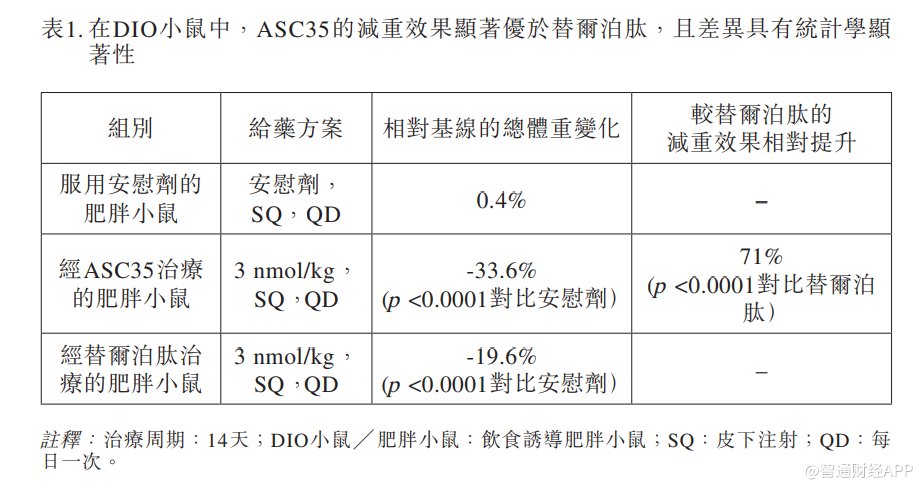 | 組別 | 給藥方案 | 相對基線的總體重變化 | 較替爾泊肽的 減重效果相對提升 | | --- | --- | --- | --- | | 服用安慰劑的 | 安慰劑, | 0.4% | | | 肥胖小鼠 | SQ . QD | | | | 經ASC35治療 | 3 nmol/kg ' | -33.6% | 71% (p <0.0001對比替爾泊 | | 的肥胖小鼠 | SO . OD | (p <0.0001對比安慰劑) | | | | | | 肽) | | 經替爾泊肽治 | 3 nmol/kg ' | -19.6% | | | 療的肥胖小鼠 | SQ .QD | (p <0.0001對比安慰劑) | | 智通财经APP讯,歌礼制药-B(01672)发布公告,已选定一款有望成为同类最佳每月一次皮下注射GLP-1受体(GLP-1R)/GIP受体 (GIPR)双靶点激动剂多肽ASC35作为临床开发候选药物。歌礼预计将于2026年第二季度向美国食品药品监督管理局 (FDA)递交 ASC35治疗肥胖症的新药临床试验申请(IND)。 ASC35是利用歌礼基于结构的AI辅助药物发现(Artificial Intel ...