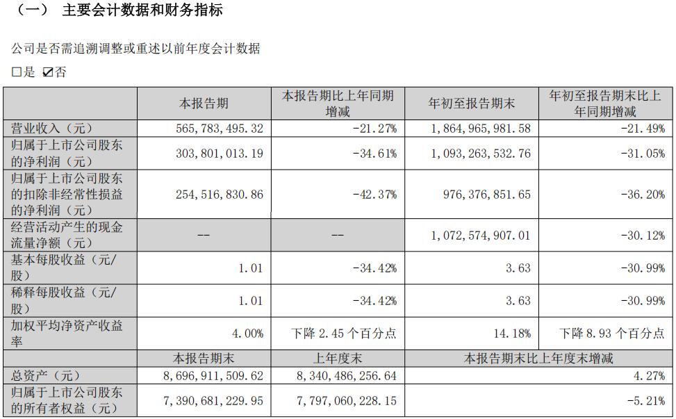| | 本报告期 | 本报告期比上年同期 | 年初至报告期末 | 年初至报告期末比上 | | --- | --- | --- | --- | --- | | | | 增減 | | 年同期增减 | | 营业收入(元) | 565.783.495.32 | -21.27% | 1.864.965.981.58 | -21. 49% | | 归属于上市公司股东 | 303,801,013.19 | -34.61% | 1,093,263,532.76 | -31. 05% | | 的净利润(元) | | | | | | 归属于上市公司股东 的扣除非经常性损益 | 254, 516, 830. 86 | -42.37% | 976. 376. 851. 65 | -36. 20% | | 的净利润(元) | | | | | | 经营活动产生的现金 | F | - | 1,072,574,907.01 | -30. 12% | | 流量净额(元) | | | | | | 基本每股收益(元/ | 1.01 | -34.42% | 3.63 | -30. 99% | | 股) | | | | | | 稀释每股收益(元/ | ...