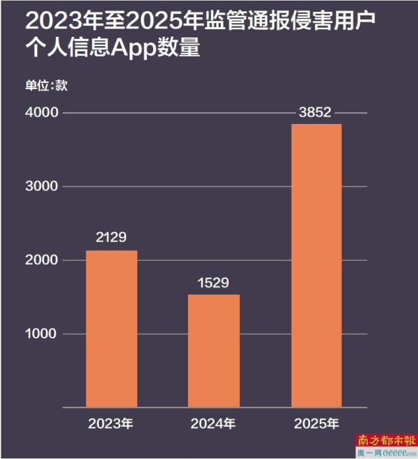 2023年至2025年监管通报侵害用户 个人信息App数量 单位:款 4000 - 3852 - 3000 - 2129 2000 - 1529 1000 - 2023年 2024年 2025年 面方都需報 刻一网 OCBCCcom 2025年全国层面App监管通报 | 不同监管机构每月通报App数量分布 ● 国家计算机病毒应急处理中心 工信部 ● 公安部计算机信息系统安全产品质量监督检验中心 中央网信办 1月 2月 3月 4月 5月 6月 7月 8月 9月 10月 11月 12月 0 20 40 80 100 120 140 60 单位:款 2025年对外通报App数量前五的单位 通报数量 上海市通信管理局 819 国家计算机病毒应急处理中心 663 工信部 335 北京市通信管理局 230 公安部计算机信息系统安全 225 在于给您您能通過品化 1 万部市報 -网 OPECCarom 在国家四部门联合开展个人信息保护系列专项行动的政策背景下,2025年,全国和地方监管部门及相关 机构通报的侵害用户权益App数量出现大幅上升,同比增加约152%。南都记者近日结合专业机构提供 的数据梳理发现,截至2025年1 ...