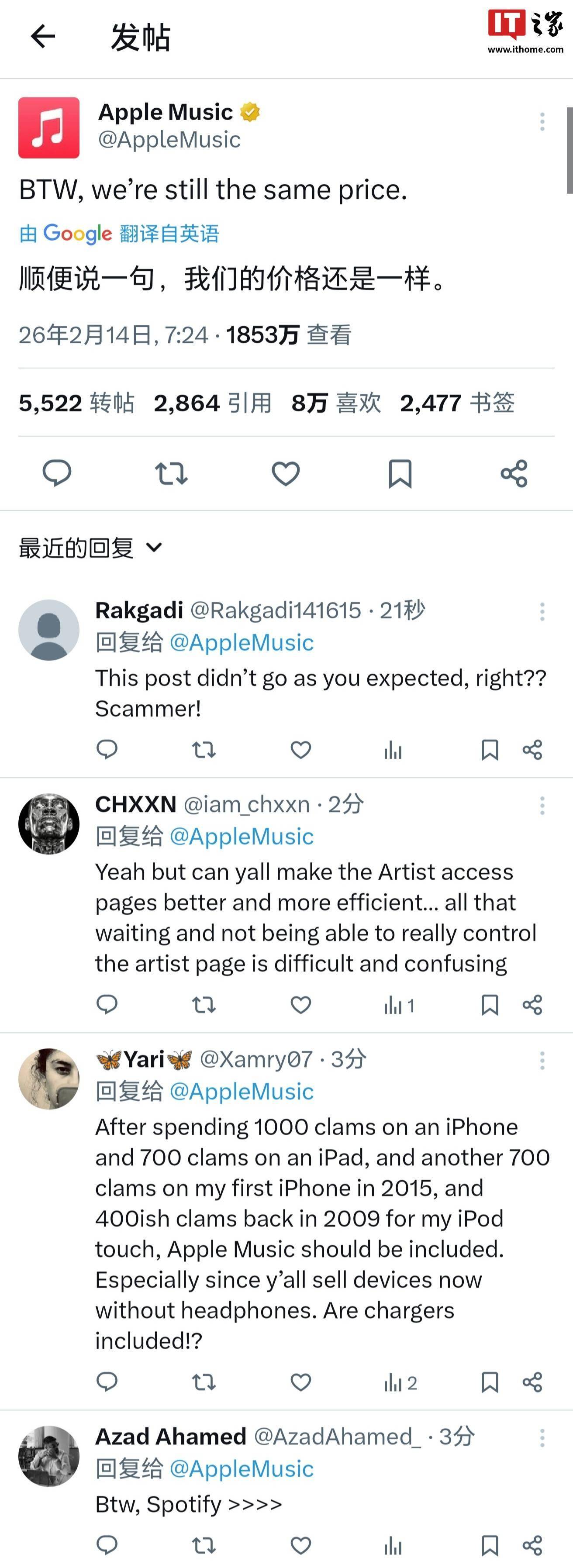 暗讽Spotify涨价?苹果Apple Music发文称依然维持原来的价格