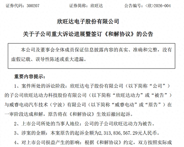 核心事件:欣旺达动力与威睿电动达成诉讼和解 - 欣旺达子公司欣旺达动力与吉利旗下威睿电动汽车技术公司就买卖合同纠纷达成一审和解,威睿电动将撤回起诉 [1] - 纠纷源于2025年12月,威睿电动因买卖合同纠纷起诉欣旺达动力,要求其支付赔偿金等款项,起诉金额超过人民币23.13亿元 [3] - 双方经协商签订《和解协议》,协议待威睿电动董事会及欣旺达动力股东会审议通过后生效 [5] 和解协议关键条款 - 双方同意对于更换动力电池包相关的费用按照实际成本进行认定,并根据实际发生金额按比例分担 [3] - 对于截至2025年12月31日已发生的成本,扣除欣旺达动力已承担部分后,其需向威睿电动支付的剩余金额为6.08亿元 [3] - 2025年12月31日之后实际发生的成本费用,双方按协议约定比例分担 [3] - 事件处理后的相关电池包全部归欣旺达动力所有 [3] - 如需配合车厂实施车辆召回,双方同意积极配合并按协议分担实际发生的成本费用 [5] - 欣旺达动力应承担的成本费用总额需在5年内(2026年至2030年)结算完毕,具体支付进度按年递增 [5] 对欣旺达的财务影响 - 根据和解协议约定及公司已计提的质保金、电池包可变现价值等因素,预计对欣旺达2025年归母净利润的影响为5-8亿元 [6] - 该影响为初步测算结果,最终以会计师审计确认后的数据为准 [6] 涉事双方背景与合作历史 - 威睿电动隶属于吉利控股集团,从事新能源汽车动力电池等业务,其51%股权由极氪控制 [6] - 欣旺达是一家锂电池供应商,2025年累计装车量为24.35GWh,同比增长0.28%,装车量占比为3.17%,在中国动力电池供应商中排名第六 [6] - 双方渊源始于2021年7月,欣旺达与吉利集团等合资成立山东吉利欣旺达动力电池有限公司,为后续供应极氪等品牌奠定基础 [7] - 2023年5月,合资公司生产的BEV 173Ah电芯下线,规划配套极氪等吉利旗下高端车型 [7] 纠纷起因 - 2024年底,部分极氪001 WE86车型车主反馈车辆存在充电变慢、电池容量衰减异常等情况 [9] - 极氪随后发起“冬季关爱活动”,为全部极氪001 WE86车型免费更换全新电池包,多方渠道信息将问题指向欣旺达供应的电芯 [9] - 该事件最终导致威睿电动于2025年12月对欣旺达动力提起诉讼 [9]