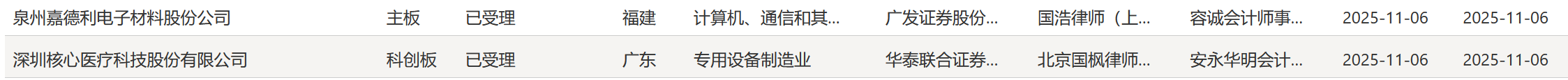 智通财经APP获悉,11月6日,上交所披露,泉州嘉德利电子材料股份公司(嘉德利)、深圳核心医疗科技股份有限公司(核心医疗)上交所IPO申请已获受理。 | 泉州嘉德利电子材料股份公司 | 主板 已受理 | 福建 | 计算机、i | | --- | --- | --- | --- | | 深圳核心医疗科技股份有限公司 | 科创板 已受理 | 广东 | 专用设备: | 据招股书,嘉德利是专注从事 BOPP 电工膜研发、生产和销售的国家级专精特新"小巨人"企业和高新技术企业,深耕 BOPP 电工膜领域超过 20 年,拥有丰 富且极具竞争力的产品储备矩阵。通过长期技术研发和工艺积累,公司在产品超薄化、耐高温和耐高压等关键技术指标方面不断取得突破,目前在不同规格 产品系列中,可分别实现 1.9µm 超薄膜、125℃超耐温膜、900V 超薄膜和 2,000V 特种脉冲薄膜等标志性产品的稳定量产,这些产品广泛应用在新能源汽 车、可再生能源、柔直输变电等新兴领域。 招股书显示,核心医疗是一家致力于提供更全面、更创新、更优质的人工心脏产品的创新医疗器械企业。截至招股说明书签署日,公司已布局 5 款植入式和 6 款介入式人工心脏产 ...
