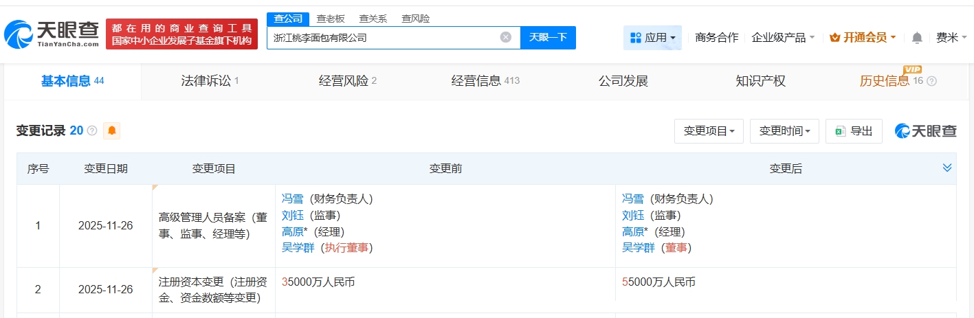 南方财经11月27日电,天眼查工商信息显示,近日,浙江桃李面包有限公司发生工商变更,吴学群由执行董事改任董事,同时注册资本由3.5亿人民币增至 5.5亿人民币,增幅约57%。浙江桃李面包有限公司成立于2017年5月,法定代表人为高原,经营范围包括食品生产、食品添加剂生产、机械设备销售、日用 百货销售等。股东信息显示,该公司由桃李面包(603866)全资持股。 | | | 夏公司 都在用的商业查询工具 | 童老板 童关系 查风险 | | | | | | --- | --- | --- | --- | --- | --- | --- | --- | | | | 家中小企业发展子其余旗下机构 | 浙江桃李面包有限公司 | × | 天眼一下 | 脂 应用 ▼ | 商务合作 1 | | 基本信息 44 | | 法律诉讼 1 | 经营风险2 | 经营信息 413 | | 公司发展 | 知识 | | 变更记录 20 ⑦ ● | | | | | | | 变更项目, | | 序号 | 变更日期 | 变更项目 | | 变更前 | | | | | 1 | 2025-11-26 | 高级管理人员备案(董 事、监事、经理等) | 冯雪 ...