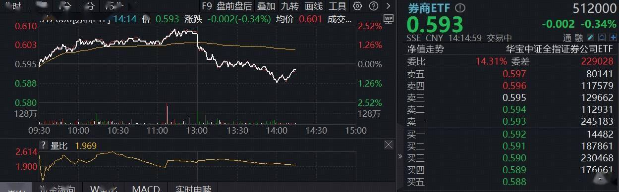 刚刚,沪深两市成交额再度突破3万亿,为连续第四个交易日量能超过3万亿大关。券商板块早盘走强, 华林证券一度涨停,顶流券商ETF(512000)场内价格一度涨逾2%,午后随市回落,现跌0.34%,实时 成交额超31亿元,环比大幅放量,显示板块交投情绪显著升温。 | 分时 多日 1分 5分 15分 · | | F9 盘前盘后 叠加 九轴 面线 工具 @ O | | 势丽ETF 1 | | 512000 | | --- | --- | --- | --- | --- | --- | --- | | 0.610 | 512000[药商ETF] 14:14 价 0.593 浴跌 -0.002(-0.34%) 均价 0.601 成交 .. | | | 593 | | -0.002 -0.34% | | | AWA | | | | | | | | more word with | | | CNY 14:14:59 交易中 | | 元日本 第 | | 0.60 | | | | 净值速势 | | 华宝中证全指证券公司ETF | | 0.595 00 | www | | 0.00% | 曼比 | 31% 증원 | 229028 ...