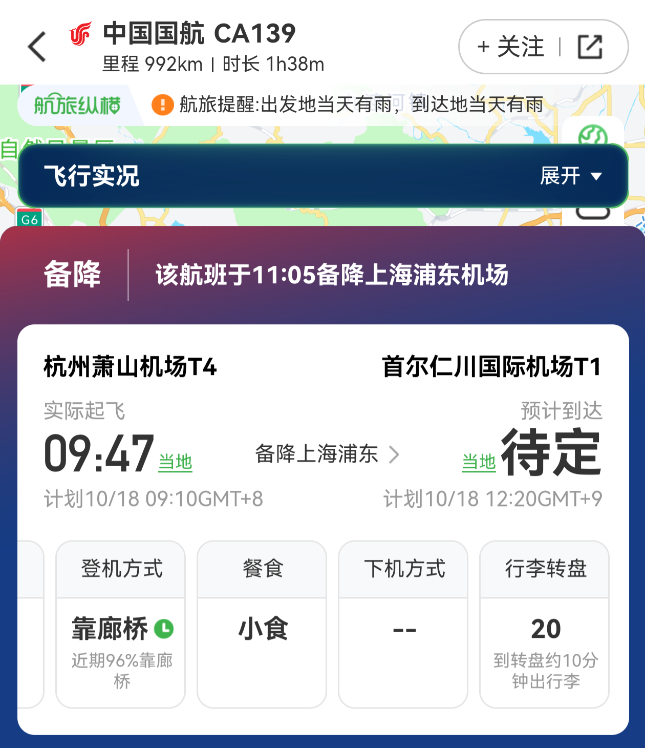 国航杭州飞韩国一航班紧急备降上海,行李架锂电池自燃无伤亡