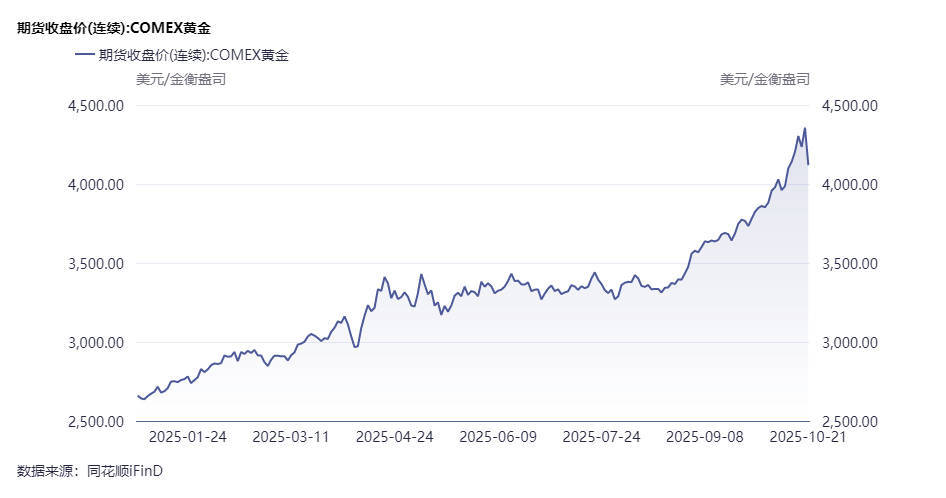 "横盘了!" 金价一天 大跌5.39% "这种极端的行情,来来回回都容易拉爆。" "今天如果再跌,很多人都扛不住了,估计都得割肉。" "涨不起来了吗?" ⋯⋯ 10月21日晚,国际金价大跌5.39%,创下今年以来最大单日跌幅。在经历"惊魂一夜"之后,黄金投资交流群里顿时炸了锅。一觉醒来,不少看多者仍然惊魂 未定,陷入进退两难的境地。 这些短期交易者所关心的是,目前的黄金价格是在蓄势上涨,还是即将进入一段长时间的震荡期? 今年以来COMEX黄金期货价格走势 黄金大跌的走势大约始于北京时间10月21日下午3点,COMEX黄金价格一路从4350美元/盎司的水平大幅下跌至4130美元/盎司附近,最终以横盘震荡结束全 天的交易,当日跌幅达5.39%,创下今年以来的最大单日跌幅。 即使从本世纪初开始算起,这样的惊魂时刻也寥寥无几。记者根据Choice金融终端统计,2000年以来单日跌幅超过2025年10月21日的只有6个交易日。比 如,2013年4月15日的单日跌幅为9.03%,2006年6月13日的单日跌幅为7.30%。 COMEX黄金价格出现单日大幅下跌的情况 | | 日期 ▼ COMEX黄金期货收盘价(美元/盎司) ...