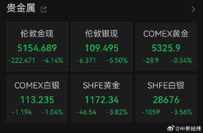 贵金属市场行情 - 现货黄金价格在30日早盘拉升后快速跳水,跌破5200美元,日内跌幅超过4% [1] - 现货白银价格跌破110美元,日内跌幅超过5% [1] 主要交易品种价格及变动 - 伦敦金现报5154.689美元,下跌222.471美元,跌幅为4.14% [2] - 伦敦银现报109.495美元,下跌6.371美元,跌幅为5.50% [2] - COMEX黄金报5325.9美元,下跌28.9美元,跌幅为0.54% [2] - COMEX白银报113.235美元,下跌1.194美元,跌幅为1.04% [2] - SHFE黄金报1172.34元,下跌46.54元,跌幅为3.82% [2] - SHFE白银报28676元,下跌1059元,跌幅为3.56% [2]