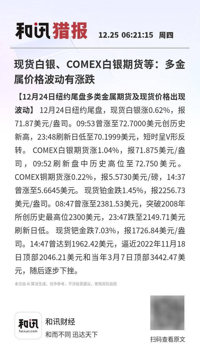 【12月24日纽约尾盘多类金属期货及现货价格出现波动】12月24日纽约尾盘,现货白银涨0.62%,报 71.87美元/盎司。09:53曾涨至72.7000美元创历史新高,23:48刷新日低至70.1999美元,短时呈V形反 转。COMEX白银期货涨1.04%,报71.875美元/盎司,09:52刷新盘中历史高位至72.750美元。COMEX铜 期货涨0.22%,报5.5730美元/磅,14:37曾涨至5.6645美元。现货铂金跌1.45%,报2256.73美元/盎司。 08:47曾涨至2381.53美元,突破2008年所创历史最高位2300美元,23:47跌至2149.71美元刷新日低。现 货钯金跌7.03%,报1726.84美元/盎司。14:47曾达到1962.42美元,逼近2022年11月18日顶部2046.21美元 和当年3月7日顶部3442.47美元,随后逐步下挫。 本文由 AI算法生成,仅作参考,不涉投资建议,使用风险自担 本文由 Al 算法生成,仅作参考,不涉投资建议,使用风险自担 和讯财经 hexun.co 和而不同 迅达天下 扫码查看原文 兀,随后逐步卜挫。 ...