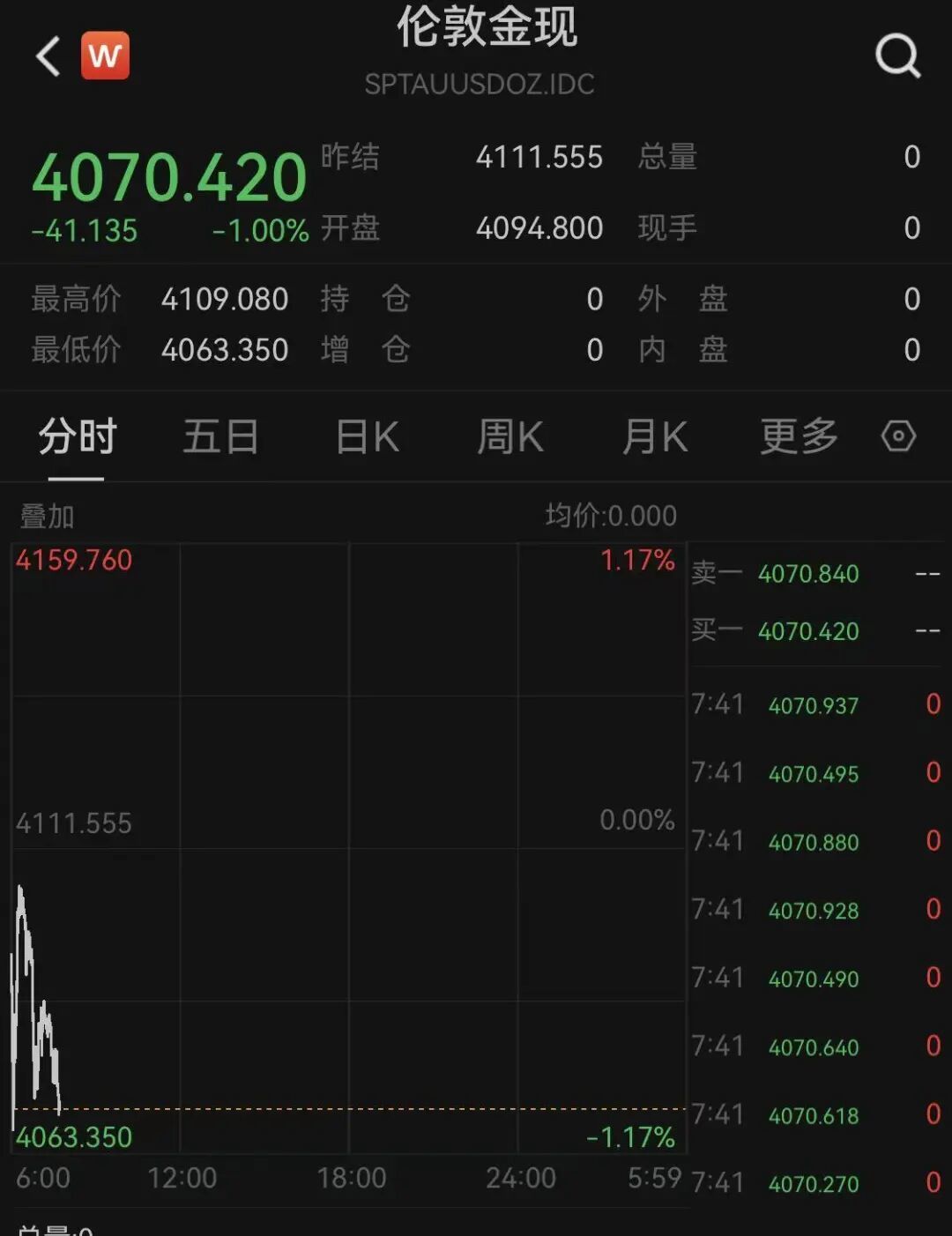 据@大河报10月26日报道,记者了解到,大批大学生涌入黄金市场,在理财平台定投黄金ETF或购买积存金。不过随着金价下跌,第一批"受害者"也随之 出现,"把生活费亏没了""一天跌光一月收益""没钱再补仓了""买2000亏50跑了"…… 专家建议:当前黄金投机氛围浓厚,年轻人多通过积存金、黄金ETF等渠道投资,操作便捷但易引发频繁盯盘与情绪化交易。普通投资者尤其是缺乏经验 的大学生,面对全球资本与专业机构处于劣势,不宜盲目入场。 截至10月27日15时30分,伦敦金跌1.04%,跌破4100美元,COMEX黄金也跌超1%。 | 15:30 | | | | | 11 2 0 1 | | | --- | --- | --- | --- | --- | --- | --- | | < W | | | 伦敦金现 | | | | | | | | SPTAUUSDOZ.IDC | | | | | 4068,850 "Fa | | | 4111.555 | 总量 | | 0 | | -42.705 | -1.04% 十字 | | 4094.800 | 现手 | | 0 | | 最高价 | 4109.080 | 持 仓 | 0 ...
