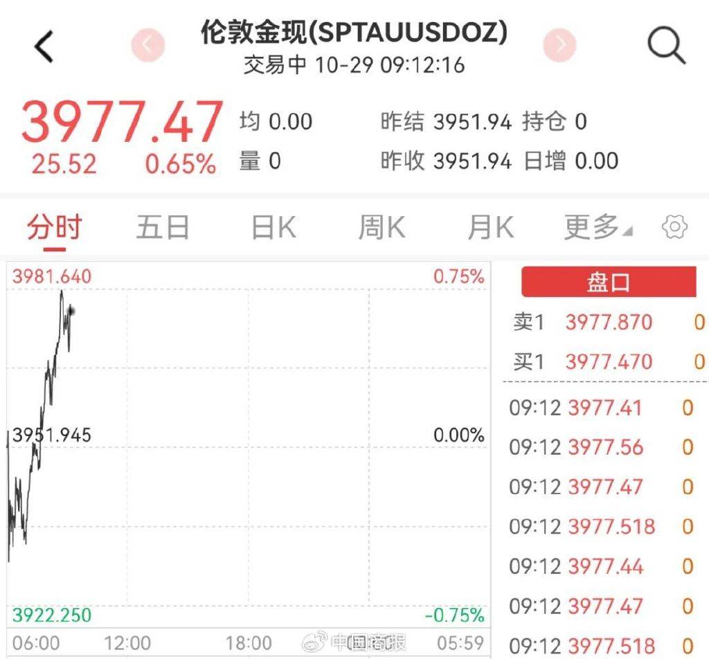 来源:中国商报 现货黄金价格突变。 北京时间10月29日,现货黄金价格走高,截至发稿报3977.47美元/盎司,COMEX黄金报3988.3美元/盎司。 | 伦敦金现(SPTAUUSDOZ) | | | | | | | --- | --- | --- | --- | --- | --- | | 交易中 10-29 09:12:16 | | | | | | | 3977.47 均 0.00 | | | 昨结 3951.94 持仓 0 | | | | 25.52 0.65% | | 宣 0 | 昨收 3951.94 日增 0.00 | | | | 分时 れ日 周K | | 日K | | 更多, ◎ | | | 3981.640 0.75% | | | | 盘口 | | | 卖1 | | | | 3977.870 买1 3977.470 | | | | | | | | 0 | | | | | | 09:12 3977.41 | 0 | | 3951.945 0.00% | | | | 09:12 3977.56 | O | | | | | | 09:12 3977.47 | 0 | | | | | | 09:12 ...