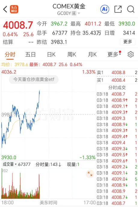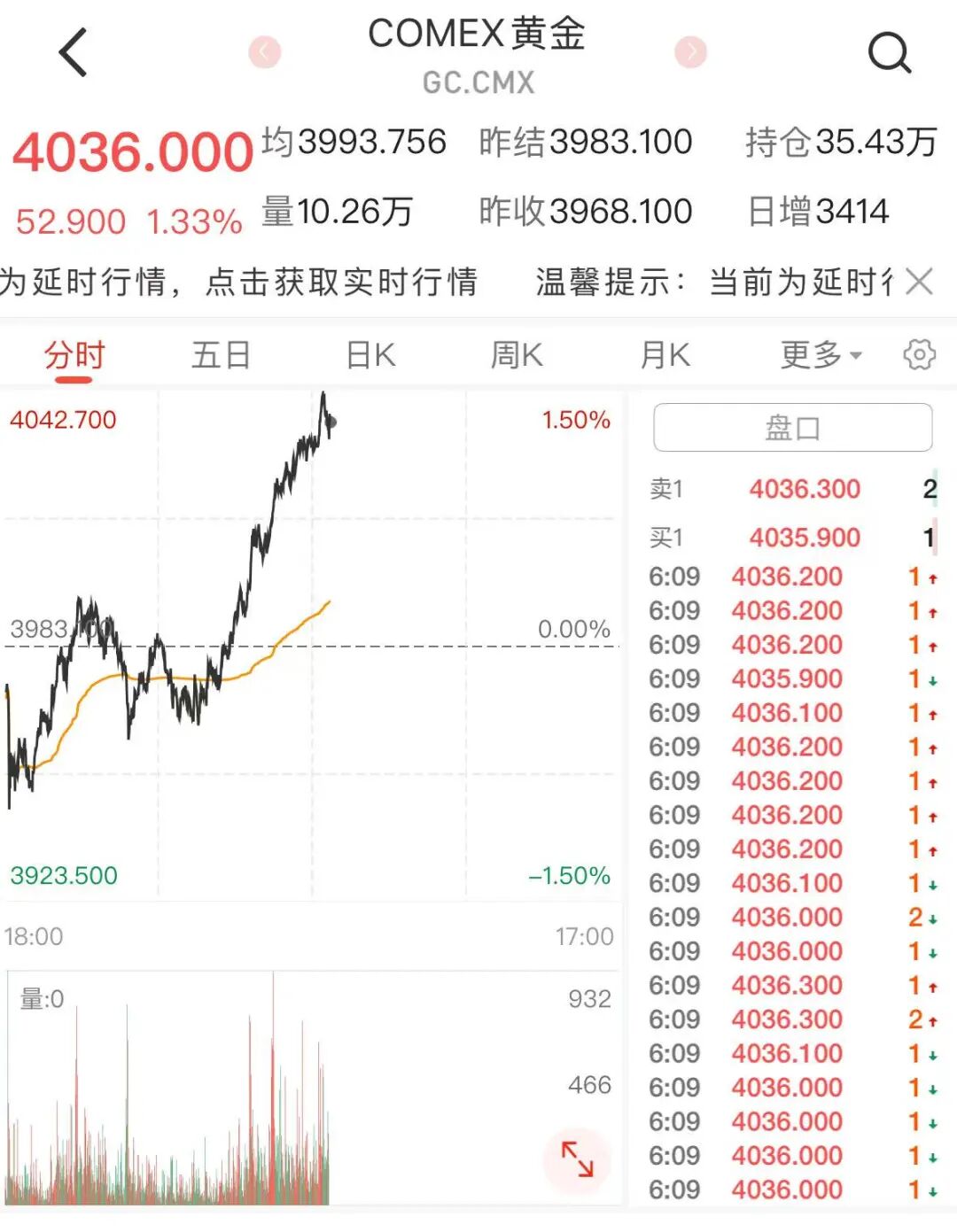 COMEX黄金价格表现 - 当前价格为4036美元 盘中最高触及4042.7美元 较前一日最低点3923.5美元有显著反弹 [1] - 价格较昨日收盘价3968.1美元上涨 但较昨日年3983.1美元有所波动 [1] - 10月28日纽约商品交易所12月黄金期价收于每盎司3983.1美元 跌幅为0.91% [2] 市场交易数据 - 当前持仓量为35.43万手 日内增加3414手 [1] - 盘中交易活跃 出现多笔在4036美元附近的成交记录 [1] 相关股票市场表现 - A股有色金属板块集体大涨 华锡有色涨超6% 中钨高新涨停 锡业股份、贵研铂业、金钼股份涨超5% [1] - 贵金属板块整体涨超3% 招金黄金、山金国际涨超4% 紫金矿业、湖南白银、山东黄金等涨超3% [1] - A股三大指数开盘后震荡拉升 沪指站上4000点 北证50指数大涨超8% [1] 价格影响因素 - 前期金价持续大幅上涨导致投资者获利回吐操作增加 [2] - 市场对国际贸易紧张局势担忧有所缓解 [2] - 投资者风险偏好回升对黄金价格构成压力 [2]