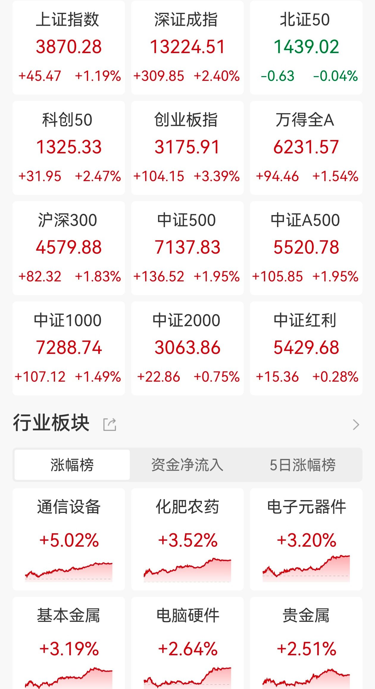 | 上证指数 | 深证成指 | 北证5( | | --- | --- | --- | | 3870.28 | 13224.51 | 1439.0 | | +45.47 +1.19% +309.85 +2.40% -0.63 -0 | | | | 科创20 | 创业板指 | 万得全/ | | 1325.33 | 3175.91 | 6231.5 | | +31.95 +2.47% +104.15 +3.39% +94.46 +1 | | | | 沪深300 | 中证500 | 中证A5( | | 4579.88 | 7137.83 | 5520.7 | | +82.32 +1.83% +136.52 +1.95% +105.85 +1 | | | | 中证1000 | 中证2000 | 中证红和 | | 7288.74 | 3063.86 | 5429.6 | | +107.12 +1.49% +22.86 +0.75% +15.36 +0 | | | | 涨幅榜 | 资金净流入 | 5日涨幅* | | --- | --- | --- | | 通信设备 | 化肥农药 | 电子元器 | | +5.02% | +3 ...