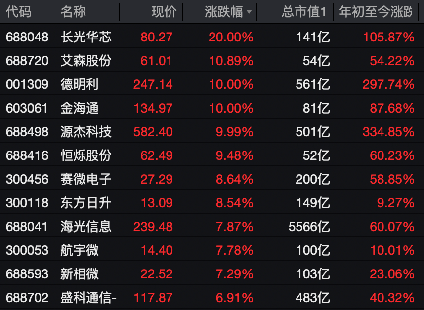 【导读】上午A股三大股指高开高走,沪指重回4000点关口上方,半导体芯片板块集体爆发 大家好,基金君和你一起关注今天上午的市场行情。 11月6日上午,A股三大股指集体高开高走,沪指重回4000点关口上方,科创50指数一度涨逾3%。截至午间收盘,沪指涨0.88%,深证成指涨1.39%,创业 板指涨1.39%。 沪深两市半日成交额为1.32万亿元,较上个交易日半日放量高达1880亿元。个股涨多跌少,市场共2712只个股上涨,58只个股涨停,2550只个股下跌。 半导体芯片板块集体走强 今天上午,大科技行情回归!半导体板块普涨,光模块(CPO)领涨市场,存储芯片板块多股上扬。 个股方面,长光华芯录得20cm涨停,德明利(001309)、金海通(603061)录得10cm涨停。中芯国际涨近4%,海光信息涨超7%,源杰科技、艾森股 份、赛微电子(300456)、东方日升(300118)跟涨。 | 代码 | 名称 | 现价 | 涨跌幅 ▼ | 总市值1 年初至今涨跌 | | | --- | --- | --- | --- | --- | --- | | 688048 | 长光华芯 | 80.27 | 20.00% | 1 ...
