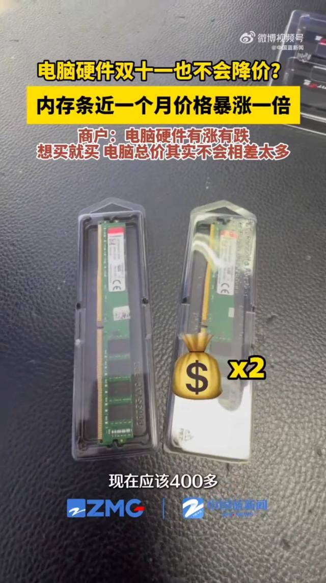 据@中国蓝新闻 ,10月28日,浙江杭州。内存条近一个月价格翻了一番。杭州数码店商户告诉记 者,"200多的涨到400多,1000多的涨到近2000。但同时显卡CPU价格回落,算下来整机价格相差不 多。电脑行业目前是白菜利润,跟双十一促销没关系,就像股票一样跟着行情走,想买随时都能买。" 电脑硬件双十一也不会降价? 内存条近一个月价格暴涨一倍 商户: 电脑硬件有涨ar 想买就买电脑总价其实不会相差大多 现在应该400多 74 MC9 ...