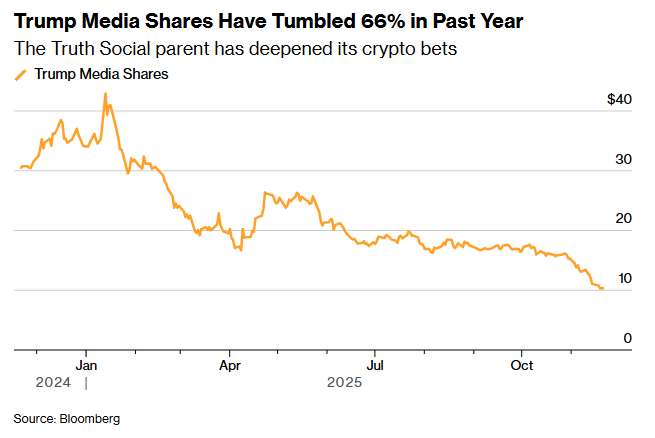 智通财经APP获悉,在特朗普担任美国总统的第二个任期内,加密资产曾重塑了其家族的财富版图。但 如今,特朗普家族及其追随者正在亲身经历加密货币与生俱来的剧烈波动。自8月以来,冠以特朗普名 字的Meme币已下跌了约四分之一。特朗普次子埃里克·特朗普持有的比特币挖矿企业股份价值较峰值缩 水近半。而今年开始囤积比特币的特朗普媒体科技集团(DJT.US)股价正徘徊于历史低点附近。 这场抛售潮是加密资产市场整体溃退的缩影——全球加密货币市值已蒸发逾万亿美元。数据显示,特朗 普家族财富从9月初的77亿美元降至约67亿美元,缩水主要源于其不断扩大的加密资产投资组合。 这些持仓涉及的远非简单押注加密货币价格涨跌,而是包含复杂交易结构。如今,普通投资者也有更多 方式投资特朗普相关项目,因此承受的风险更大。例如,在就职典礼周末追高买入特朗普Meme币的投 机者,截至本月几乎血本无归。 作为Truth Social的母公司,特朗普媒体科技集团股价于上周三创下历史新低。此番下跌至少部分归因于 该公司不合时宜的加密货币投资。自9月以来,特朗普在该公司的持股价值蒸发约8亿美元。作为公司最 大股东,其股份由长子小唐纳德·特朗普管理的信托持有 ...