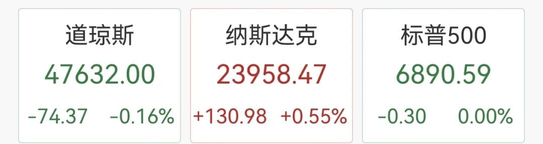 牛市来了还没上车?上天天基金APP搜索777注册即可领500元券包,优选基金10元起投!限 量发放!先到先得! 美国三大股指收盘涨跌不一,纳指连续第四日创新高 。英伟达总市值站上 5 万亿美元大关 。大型科技股多数上涨。中概股涨跌不一。 美联储如期降息,鲍威尔重磅发声。 纳指连续第四日创新高 美国三大股指收盘涨跌不一,道指跌 0.16% 报 47632 点,标普 500 指数持平报 6890.59 点,纳指涨 0.55% 报 23958.47 点,连续第四日创新高。波音跌 4.38% ,联合健康集团跌 3.34% ,耐克跌 3.10% ,领跌道指。 英伟达总市值站上 5 万亿美元大关 英伟达 CEO 黄仁勋 GTC 华盛顿特区主题演讲再次引爆投资者热情。公司股价高开高走,一 度大涨 5.55% ,上探 212.19 美元高位,全天收于 207.04 美元,涨 2.99% ,总市值达 5.03 万亿美元,首度站上 5 万亿美元大关。 黄仁勋表示,英伟达在 30 年持续投入中构建了以 GPU 与 CUDA 为核心的加速计算体系, 彻底突破摩尔定律瓶颈。通过重新设计算法内核,打造超过 350 个专用加速库,覆盖芯片 ...