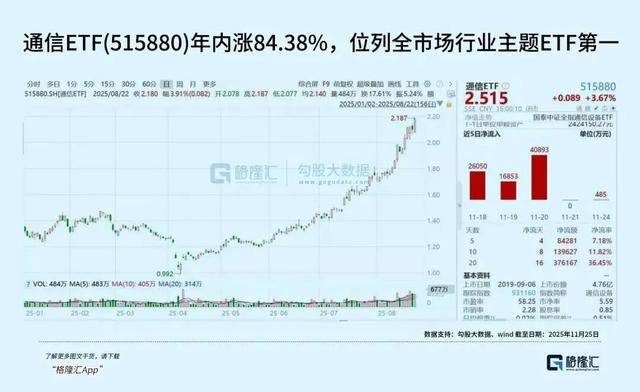 A股市场表现 - 11月25日A股三大指数集体收涨,上证指数涨0.87%,深证成指涨1.56%,创业板指涨1.77%,北证50涨0.76% [1] - AI应用概念股集体爆发,通信设备、CPO、光纤等AI硬件方向全天强势,通信ETF(515880)当日上涨3.67% [1] - 通信ETF(515880)今年以来涨幅达84.38%,位列A股全市场行业主题ETF第一 [1] 全球AI产业动态与谷歌的崛起 - Meta据悉正考虑斥资数十亿美元购买谷歌的TPU,用于其数据中心建设,此消息推动谷歌股价强势表现,其AI芯片合作伙伴博通股价暴涨11.1% [5] - 谷歌自研TPU的潜在交易可能抢占英伟达年收入的10%份额,为谷歌带来数十亿美元新增收入 [6] - 谷歌通过自研TPU、OCS网络、Gemini模型到应用构筑了完整的技术与商业闭环,其AI基础设施负责人披露公司服务容量每六个月翻倍增长,未来五年计划实现1000倍扩展 [16] - 谷歌年内股价涨幅达68.84%,是2025年“七大科技巨头”中表现最强的股票 [6] - 谷歌发布的Gemini 3 Pro在多项基准测试中表现突出,尤其在代码生成、逻辑推理、多模态能力上展现出结构性优势,被认为已超越OpenAI的GPT-5.1模型 [17] - OpenAI首席执行官在内部备忘录中罕见承认,谷歌在AI领域的最新进展可能给OpenAI带来“暂时的经济逆风” [17] AI模型竞争与迭代 - 在谷歌发布Gemini 3 Pro后,Anthropic随即发布Claude Opus 4.5,其编程实力强劲 [7] - 国内应用方面,阿里连续发布千问、灵光等AI应用,千问公测一周下载量突破1000万,成为至今增长最快的AI应用;通用AI助手灵光上线6天总下载量突破200万 [9] AI算力产业链与投资机会 - 谷歌的强势表现助推了市场对明年算力资本开支和芯片采购加速的预期 [16] - 随着TPU出货量预期上修、OCS渗透率提升以及1.6T光模块放量,相关硬件供应商将迎来发展机遇 [17] - 谷歌与博通的组合,正展现出对以微软、Oracle等为代表的“OpenAI链”的替代趋势 [6] - 英伟达作为第三方芯片供应商,其CUDA+GPU组合因易上手且性能成本易于衡量,仍被AI界广泛验证,与谷歌链共同构成富有想象力的组合 [20] - 四季度以来国内AI、通信产业链回调时间和幅度相对充分,存在技术性反弹的布局良机 [20] 通信ETF(515880)概况 - 通信ETF(515880)跟踪的通信设备指数中,“光模块+服务器+铜连接+光纤”合计权重占比超过81%,其中光模块独占52%,服务器占比达22% [21] - 前十大重仓股中,“易中天”(新易盛、中际旭创、天孚通信)合计占比超过43% [21] - 截至11月24日,该ETF本月净流入15.01亿元,年内净流入达76.88亿元,最新规模为118.87亿元,年内规模增幅超过380% [22] - 该ETF为投资者提供一键布局通信赛道的便捷工具,其联接基金(A:007817;C: 007818)为场外投资者提供布局工具 [21][26] 行业长期趋势 - AI带动通信行业成长逻辑从运营商资本开支周期切换到人工智能浪潮,对算力基础设施的持续增加带动行业市值提升 [27] - 2023年以来的通信板块,三季报后调整常见,但AI带动的算力需求旺盛,调整被视为机会 [29] - 谷歌的成功证明行业底层逻辑并未被破坏,只要处于景气周期,回撤并不可怕 [29]