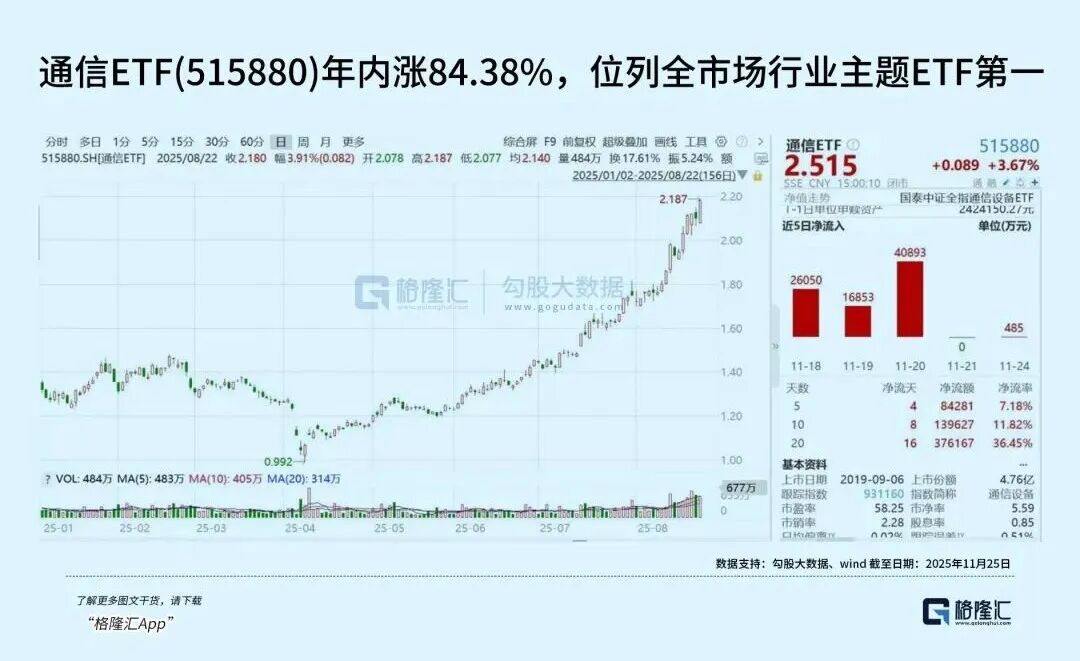 A股三大指数集体收涨,截至收盘,上证指数涨0.87%,深证成指涨1.56%,创业板指涨1.77%,北证50 涨0.76%。 昨夜谷歌+博通的大涨吹响了AI反弹的号角,今天谷歌供应链+AI应用概念在A股集体爆发。 到底发生了什么? 01 "AI新王"诞生 盘面上,科技股情绪明显好转,热点分散,但真正的主角只有一个:AI。 通信设备、CPO、光纤概念等AI硬件方向全天强势,光模块王者归来,通信ETF(515880)上涨3.67%。 今年以来,通信ETF(515880)涨幅达84.38%,位列A股全市场行业主题ETF第一。 尽管上周英伟达发布超预期业绩未能带领AI交易链大反攻,产业界日新月异的迭代又再一次引爆全 球,而且是接连上演。 消息面上,Meta据悉正考虑斥资数十亿美元购买谷歌的TPU,句括用于Meta的数据中心建设。 受此消息影响,谷歌昨日股价表现强势,其AI芯片合作伙伴博通暴涨11.1%,创下自4月9日以来的最佳 单日表现,两者共同推动了科技板块的反弹。 作为这一事件的主角,谷歌如今在AI界的地位可谓"平步青云"。 据分析,谷歌将自研的TPU部署于自有数据中心并向大型客户出租算力,这一潜在交易可能让谷歌抢 ...