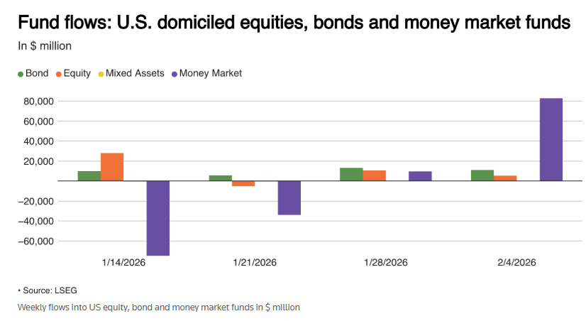 文章核心观点 - 全球资金因担忧AI颠覆软件行业而引发历史级抛售 导致美国股票型基金需求在截至2月4日当周明显降温 资金净流入额环比大幅下降约48% [1] - 市场风险偏好发生显著轮动 资金从高估值、高波动的科技板块撤出 转向价值型、周期型及固定收益类资产 [5][8] 美国股票型基金资金流向 - 截至2月4日当周 美国股票型基金净流入额仅为约55.8亿美元 较前一周的108.2亿美元大幅下降约48% [1] - 大盘股基金录得约11亿美元净流入 显示市场对七大科技巨头等蓝筹股的热情持续 [5] - 中盘股基金和小盘股基金分别出现约15.9亿美元和16.7亿美元的资金流出 [5] 行业/板块资金配置变化 - 科技板块出现大规模资金撤出 净流出约23.4亿美元 [5] - 资金流入估值偏低的工业类价值板块 净流入21.1亿美元 [5] - 资金流入金属与采矿板块 净流入约14.4亿美元 [5] - 资金流动方向显示市场风险偏好正从科技转向价值、周期及资源板块 [5][8] 债券及货币市场基金资金流向 - 美国债券型基金连续第五周实现大规模净流入 规模达111.1亿美元 [8] - 短至中期投资级债券基金净流入约63.4亿美元 创下至少自2022年以来的单周最大规模 [8] - 市政债基金吸引23.8亿美元净流入 [8] - 抗通胀保值债券基金吸引13.4亿美元净流入 [8] - 美国货币市场基金录得830.9亿美元净买入 创下自截至12月3日当周1050.8亿美元流入以来的最大规模 [11] AI技术进展引发的市场冲击 - Anthropic推出的AI编程工具Claude Cowork加剧了市场对AI颠覆SaaS软件行业的恐惧 [4] - Anthropic本周推出的新AI工具能执行多项文书工作 包括追踪合规和审阅法律文档 [4] - 最新推出的Claude Opus 4.6模型在AI编程、财务分析、法律文件分析等领域全面领先 [4] - 相关AI进展冲击了以金融分析、法律文档审阅等为核心护城河的SaaS公司 导致FactSet盘中暴跌10% 汤森路透、S&P Global等公司股价延续暴跌 [4]