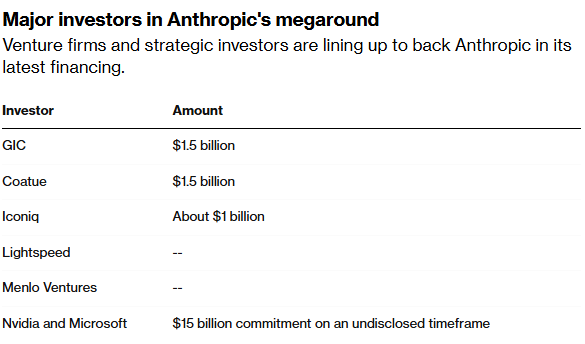 融资概况 - Anthropic在最新一轮融资中从Coatue Management、新加坡政府投资公司(GIC)和Iconiq Capital等机构获得至少10亿美元投资 [1] - 本轮融资认购踊跃,支持者承诺投入的资金将超过公司此前设定的100亿美元融资目标 [1] - 加上英伟达和微软此前已承诺的150亿美元,此次融资总规模很可能轻松超过200亿美元 [1] 财务与运营表现 - Anthropic的收入运行率自去年夏天以来已翻了一番多,预计到2025年底将超过90亿美元 [1] - 公司的收入运行率在去年7月为40亿美元 [1] - 公司计划在人工智能基础设施方面进行大量投资,并已承诺在美国投资500亿美元建设数据中心 [4] 投资者与投资额 - 领投方Coatue Management和GIC预计各自投资约15亿美元 [2] - Iconiq Capital计划投资10亿美元或更多,并曾于去年9月领投Anthropic的上一轮融资 [2] - Lightspeed Venture Partners、Menlo Ventures和Sequoia Capital也有望参与此轮融资 [2] - 英伟达和微软此前已承诺投资150亿美元,但投资时间表未披露 [3] 产品与技术进展 - Anthropic的人工智能工具Claude已成为企业和开发者编写代码及执行其他任务的首选工具 [3] - 9月份发布的新版本Claude Sonnet 4.5更擅长执行指令,并且可以连续自主编码长达30小时 [3] - 该服务可以利用用户的电脑来执行操作,这是对一年前推出功能的改进,有助于推动人工智能向更加自主的方向发展 [3] 行业趋势与战略合作 - 微软和英伟达对Anthropic的战略投资,加剧了人工智能开发商与云计算或芯片供应商之间日益增多的合作关系 [4] - 行业观察人士和评级机构密切关注“人工智能交易循环”的兴起,在这种交易中,供应商同时也是公司的投资者 [4] - Anthropic在利用微软和英伟达投资的同时,本身也是这两家公司的客户 [4] - 围绕人工智能行业的并购活动表明,开发和支持人工智能工具的成本正在飙升,仅数据中心一项的支出在未来五年就可能超过3万亿美元 [4]
