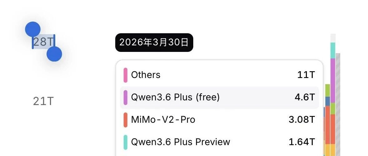大模型周度使用量排行榜 - 根据OpenRouter平台数百万用户的真实使用数据,本周(截至2026年3月30日)全球大模型周调用总Token量达到27万亿(27.0T)[3][5][6] - 本周排名第一的模型是阿里(Alibaba)的Qwen3.6 Plus(免费版),使用量为4.60万亿Token,为新上榜即登顶全球第一[1][6] - 排名第二的模型是小米(Xiaomi)的MiMo-V2-Pro,使用量为3.08万亿Token[1][5] - 排名第三的模型是MiniMax的M2.7,使用量为1.19万亿Token[1][5] - 排名第四的模型是阶跃星辰(Stepfun)的Step 3.5 Flash(免费版),使用量为1.26万亿Token,周环比增长16%[1] - 排名第五的模型是深度求索(DeepSeek)的V3.2,使用量为1.19万亿Token,周环比增长4%[1] - 排名第六的模型是Anthropic的Claude Sonnet 4.6,使用量为1.03万亿Token[1] - 排名第七的模型是Anthropic的Claude Opus 4.6,使用量为1.02万亿Token,周环比增长12%[1] - 排名第八的模型是谷歌(Google)的Gemini 3 Flash Preview,使用量为9800亿Token,周环比增长1%[2] - 排名第九的模型是MiniMax的M2.5,使用量为8480亿Token,周环比下降7%[2] 大模型使用量市场格局与趋势 - 全球大模型周使用总Token量环比增长18.9%[6] - 中国模型使用量合计达12.96万亿Token,占全球总量的48%,环比大幅增长31.48%[6] - 美国模型使用量合计为3.03万亿Token,占全球总量的11.2%,环比微增0.76%[6] - 中国模型使用量已连续5周超过美国模型使用量[6] - 阿里(Alibaba)的Qwen3.6 Plus模型表现尤为突出,于4月2日发布后,在4月4日单日使用量即达到1.41万亿Token,创下纪录[6] 历史数据对比 - 与2025年4月7日的历史数据相比,当前全球大模型周使用总Token量(27.0T)显著增长[5]