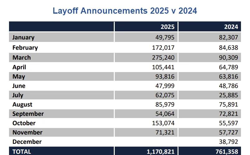 全球职业介绍公司Challenger, Gray & Christmas公布的数据显示,今年前11个月,美国企业计划裁员总数逼近117.1万人。 这个数字有多吓人?它不仅是疫情以来最高的年度裁员水平,也是近三十年来第六次突破110万大关。 裁员重灾区究竟是谁? | | 2025 | 2024 | | --- | --- | --- | | January | 49,795 | 82,307 | | February | 172,017 | 84,638 | | March | 275,240 | 90,309 | | April | 105,441 | 64,789 | | May | 93,816 | 63,816 | | June | 47,999 | 48,786 | | July | 62,075 | 25,885 | | August | 85,979 | 75,891 | | September | 54,064 | 72,821 | | October | 153,074 | 55,597 | | November | 71,321 | 57,727 | | December | | 38,79 ...