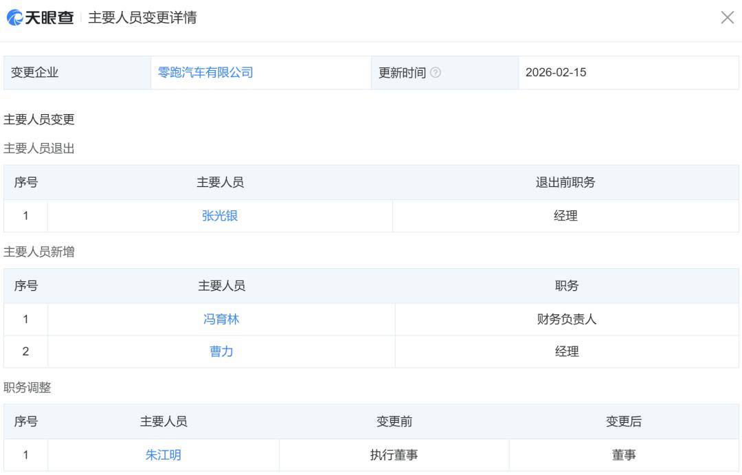 公司工商信息变更 - 零跑汽车有限公司注册资本由47.08亿元人民币增加至55.58亿元人民币,增幅达18% [1] - 公司主要人员发生变动:张光银卸任经理,由曹力接替;戴永娟卸任财务负责人,由冯育林接替;朱江明职务由执行董事变更为董事 [1][4][5][6] 新任核心管理人员背景 - 新任经理曹力出生于1984年5月,毕业于浙江理工大学,于2015年作为创始人团队成员加入零跑汽车,曾担任整车研发负责人、高级副总裁等职务,现任公司高级副总裁及第二届董事会执行董事候选人 [6] 公司发展历程与产品布局 - 公司成立于2015年,于2022年9月在港交所上市,成为继蔚来、小鹏、理想之后登陆港股的造车新势力 [6] - 公司旗下产品涵盖多个系列车型,包括零跑C11、T03、C16、C10、C01、B10、B01、Lafa5等 [6] - 2025年,公司发布并上市了B系列首款车型B10、首款轿车B01、Lafa5以及C11改款,这些车型是其2025年销量稳定增长的关键 [6] 未来产品规划与销量目标 - 2026年,公司计划上市D19、D99、A10等多款车型,届时将形成A、B、C、D四大产品系列矩阵 [7] - 公司CEO朱江明于2025年11月表示,2026年销量目标为100万辆 [7] - 2026年2月5日,公司COO徐军透露,已将2026年销量目标由100万辆上调至105万辆 [7]