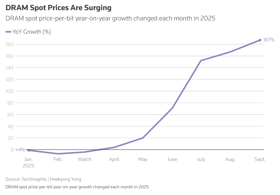 以下文章来源于科创日报 ,作者潇湘 科创日报 . 科创圈都在关注的主流媒体,上海报业集团主管主办,《科创板日报》出品。 随着内存价格在2025年迎来暴涨——DDR4价格暴涨超两倍,16GB条突破500元,一根普普通通的DDR4内存条,再度被不少行业人士和游戏玩家 们,调侃为了今年最佳的理财产品之一…… 根据TechInsights提供的数据,用于各种应用的DRAM现货价格在4月份同比仅上涨4%之后,9月份已较去年同期上涨了近两倍。 有迹象显示,随着芯片制造商竞相投入于人工智能芯片的全球热潮,正导致智能手机、计算机和服务器中广泛使用的普通存储芯片供应趋 紧,并引发了部分客户恐慌性采购,继而进一步推高了价格。不少行业高管和分析师还指出,AI热潮带来的意外连锁反应,正为三星电子等 内存芯片制造商注入急需的动力——这些企业此前在先进人工智能芯片领域落后于竞争对手,但如今其股价正迎来大幅反弹。 随着普通存储芯片的供应已趋紧,全球存储芯片行业似乎正加剧迈入许多分析师所称的"超级周期",设备制造商正疯狂囤积存储芯片。 "过去一两个月需求激增,"半导体分销商Fusion Worldwide总裁Tobey Gonnerman表 ...