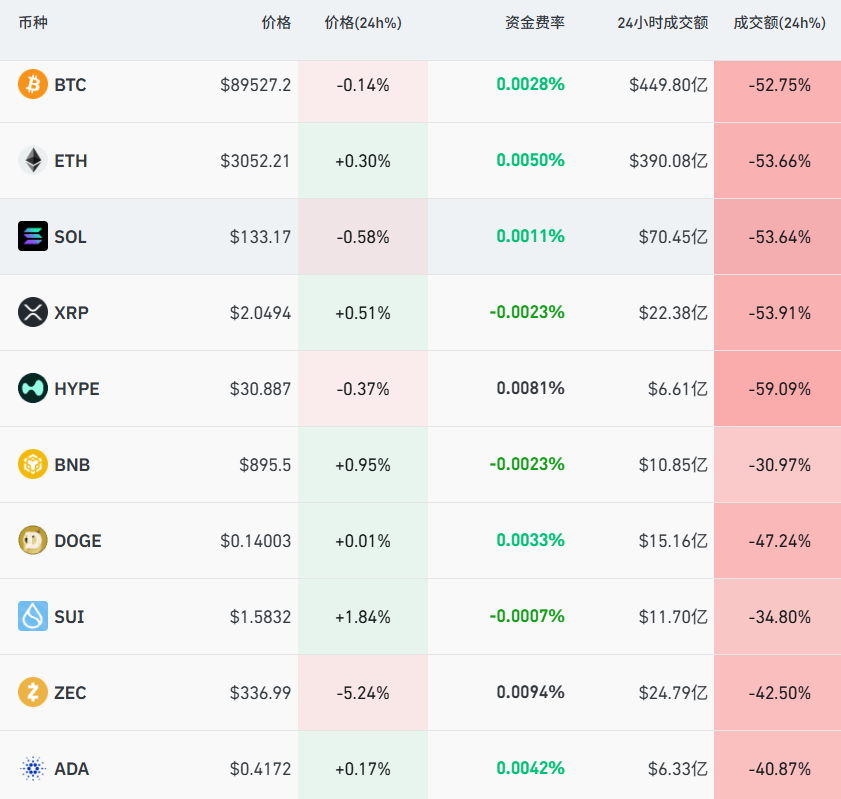 加密货币市场近期动态 - 比特币价格在12月7日早间一度跌破89,000美元,而前一晚曾触及90,000美元,显示年末价格震荡加剧 [1] - 截至12月7日11:09,主要加密货币近24小时成交额全线大幅下跌,比特币、以太坊、SOL等主要品种成交额均腰斩,跌幅超过50% [1] - 根据表格数据,比特币24小时成交额为449.80亿美元,下降52.75%;以太坊成交额为390.08亿美元,下降53.66%;SOL成交额为70.45亿美元,下降53.64% [2] 主要加密货币价格与成交表现 - 比特币最新价格为89,527.2美元,24小时微跌0.14%,资金费率为0.0028% [2] - 以太坊价格为3,052.21美元,24小时上涨0.30%,资金费率为0.0050% [2] - SOL价格为133.17美元,24小时下跌0.58%,资金费率为0.0011% [2] - 其他币种如BNB上涨0.95%至895.5美元,SUI上涨1.84%至1.5832美元,而ZEC跌幅较大,下跌5.24%至336.99美元 [2] 市场爆仓情况 - 近24小时内,加密货币市场共有100,119人被爆仓,爆仓总金额达1.14亿美元 [2][3] - 分时段看,24小时爆仓金额为1.14亿美元,其中多头爆仓5,364.38万美元,空头爆仓6,008.27万美元 [3] - 12小时爆仓金额为5,357.81万美元,4小时爆仓金额为1,730.76万美元,1小时爆仓金额为301.41万美元 [3] 比特币价格与机构观点 - 按比特币最新价8.95万美元计算,其较今年12.6万美元的历史高点已下跌近29% [3] - 摩根大通预计比特币在未来6至12个月内可能会上涨84%,目标价达到17万美元 [3] - 摩根大通认为比特币的交易方式可能会更接近黄金,今年4月对关税的担忧曾推动资金流入比特币 [3] 宏观消息面 - 联邦公开市场委员会计划在12月9日至10日的会议上审议利率 [4] - 市场对美联储12月降息的预期押注大幅上升,据CME FedWatch数据,12月降息的可能性目前约为87% [4]