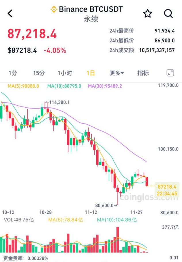 比特币市场行情 - 比特币价格于12月1日早盘闪崩,跌破8.7万美元,日内跌幅一度扩大至5.9% [1] - 截至当日18时24分,比特币报86680美元,24小时跌幅为5.14%,月内跌幅近20% [1] - 自10月初创下12.63万美元历史新高后,比特币累计跌幅已超31%,年内涨幅悉数回吐 [1] 其他虚拟货币表现 - 以太坊报2839美元,24小时跌幅5.67%,月内跌幅25.37% [3] - 瑞波币24小时下跌6.9%,报2.04美元 [3] - 币安币、DOGE币分别下跌6.03%、7.98% [3] 市场暴跌原因分析 - 宏观流动性边际收紧是核心驱动,美联储降息预期推迟及美元流动性边际收缩影响高波动资产 [3] - 美国财政部一般账户因政府停摆抽离约2000亿美元市场流动性,加剧资金成本上升 [3] - 市场结构脆弱,买盘支撑不足,10月初约190亿美元杠杆头寸清算余波未平 [3] - 美国现货比特币ETF资金流入持续疲软,出现单周净流出超10亿美元的情况 [3] - 价格跌破关键点位后触发高杠杆多头连锁强制平仓,形成下跌恶性循环 [3] 监管与情绪影响 - 中国人民银行联合多部门重申虚拟货币相关业务活动属于非法金融活动 [4] - 欧盟MiCA法案对稳定币实施严格限制,从政策和合规层面压制市场情绪 [4] - 特朗普关联代币极端崩盘严重打击市场投机信心,恐慌情绪蔓延至主流币 [4] 杠杆合约与爆仓情况 - 当日虚拟资产市场一度超19万人被爆仓,爆仓总金额达5.53亿美元 [4] - 多单爆仓金额为4.8亿美元,空单爆仓金额为7260.11万美元 [4] - 杠杆会等比例放大亏损,10倍杠杆下价格反向波动10%即可导致保证金全部损失 [4] - 市场剧烈波动时的“插针”现象可能瞬间击穿强平线,导致投资者爆仓 [4] - 单一币种暴跌引发集中平仓会进一步打压价格,形成踩踏循环,加剧系统性波动 [4] 投资者行为与风险 - 高收益诱惑使投资者忽视风险管理,进行重仓、扛单等赌博式操作,导致巨额亏损 [5] - 参与高倍杠杆合约交易无异于赌博,应视为专业机构对冲工具而非个人投机手段 [6] - 境内投资者必须充分认识政策红线,保护自身财产安全,远离非法金融活动 [6]