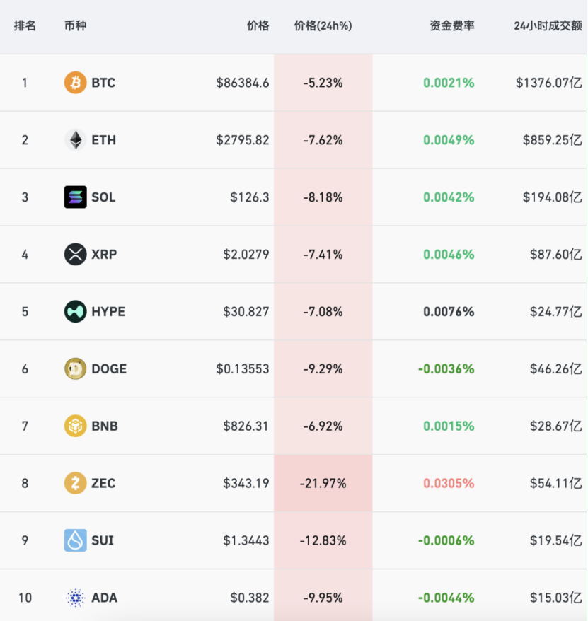 市场整体表现 - 12月1日,加密货币市场整体呈现下跌态势,比特币短时跌破87000美元,截至发稿报87218.4美元/枚,下跌4.05% [1] - 以太坊报2852.83美元/枚,下跌4.84%,其他主要币种如ZEC、HYPE、DOGE分别下跌15.51%、9.84%和6.2% [3] - 市场总市值约3.1万亿美元,但周均成交额仅为1270亿美元,市场交易量持续低迷 [6] 主要币种价格与成交动态 - 比特币24小时价格下跌3.83%,报87356.3美元,24小时成交额为583.85亿美元,大幅增长48.80%,市值为1.74万亿美元 [4] - 以太坊24小时价格下跌4.84%,报2852.83美元,24小时成交额为527.55亿美元,增长13.52%,市值为3438.12亿美元 [4] - 其他市值前列币种如SOL、XRP、BNB价格分别下跌5.58%、5.88%、4.22%,但24小时成交额普遍显著增长,其中SOL增长63.13%,BNB增长105.83% [4] 市场杠杆与爆仓情况 - 最近24小时内,加密货币市场约18万人被爆仓,爆仓总金额为5.37亿美元 [4] - 爆仓以多单为主,多单爆仓金额为4.7亿美元,空单爆仓金额为6527.3万美元 [4] - 分时段看,过去24小时、12小时、4小时和1小时的总爆仓金额分别为5.4亿、4.7亿、4.3亿和1.7亿美元,多单爆仓金额均远高于空单 [5] 市场结构与趋势展望 - 比特币在92000美元/枚附近再度遇阻,尽管降息预期升高,但未能突破该关键阻力位,其上周末周成交额为599亿美元,较均值低31% [6] - 行业观点认为,经历2024-2025年,市场参与者结构已不同,机构资金占比提高意味着未来价格波动将更受基本面和数据驱动,短期情绪影响减弱 [6] - 后续机构博弈与理性定价将成为常态,2026年的比特币市场将更加成熟理性,但暴富暴亏的戏码将更难重演 [6]