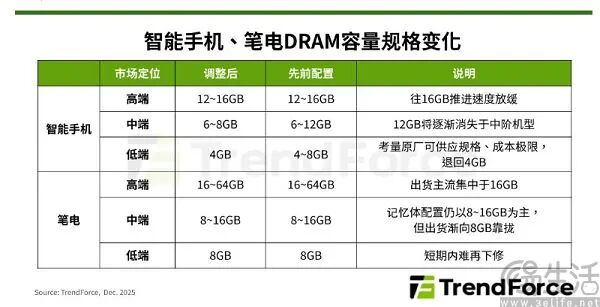 | | | | 智能手机、笔电DRAM容量规格变化 | | | --- | --- | --- | --- | --- | | | 市场定位 | 调整后 | 先前配置 | 说明 | | | 高端 | 12~16GB | 12~16GB | 往16GB推进速度放缓 | | 智能手机 | 中端 | 6~8GB | 6~12GB | 12GB将逐渐消失于中阶机型 | | | 低端 | 4GB | 4~8GB | 考量原厂可供应规格、成本极限, 張回4GB | | | 高端 | 16-64GB | 16-64GB | 出货主流集中于16GB | | 笔电 | 中端 | 8~16GB | 8~16GB | 记忆体配置仍以8~16GB为主, 但出货新向8GB靠拢 | | | 低端 | 8GB | 8GB | 短期内难再下修 | | | | | | F- Trand | 由于内存价格飙升,最近一段时间想要攒一台电脑的玩家迎来了至暗时刻。截至2025年第三季度末, DRAM内存颗粒的合约价同比涨幅已达171%,甚至超过了同期黄金的上涨幅度,堪称年度最佳理财产 品。 作为当下消费类电子产品最为常用的半导体存储器,内存涨价不仅是 ...