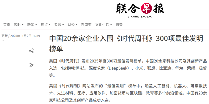 美国《时代周刊》评出2025年度300项最佳发明:中国宇树科技、DeepSeek、小米等20余家企业入围