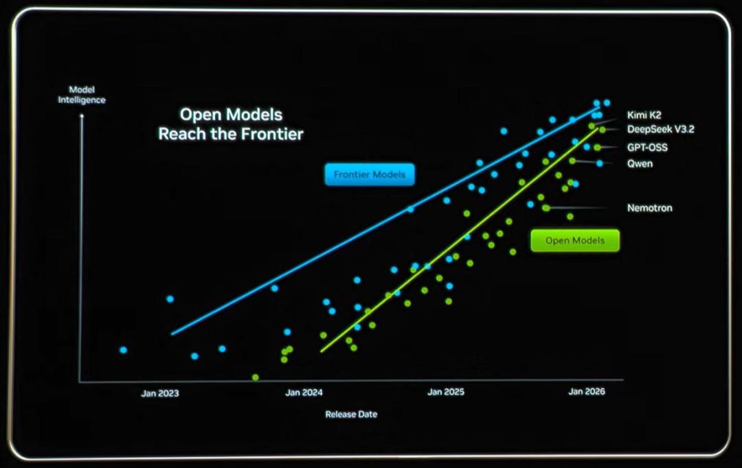 CES巨幕上,老黄的PPT已成中国AI的「封神榜」。DeepSeek与Kimi位列C位之时,算力新时代已至。 万众瞩目的2026 CES科技盛宴上,一张PPT瞬间燃爆AI圈。 老黄主旨演讲上,中国大模型Kimi K2、DeepSeek V3.2,以及Qwen赫然上屏,位列全球开源大模型前列,性能正在逼近闭源模型。 这一刻,是属于中国AI的高光时刻。 另外,OpenAI的GPT-OSS和老黄自家的Nemotron,也做了标注。 而且,DeepSeek-R1、Qwen3 和 Kimi K2 代表着MoE路线下顶级规模的尝试,仅需激活少量参数,大幅减少计算量和HBM显存带宽的压力。 在下一代Rubin架构亮相的核心环节上,老黄还选用了DeepSeek和Kimi K2 Thinking来秀性能。 在Rubin暴力加成下,Kimi K2 Thinking推理吞吐量直接飙了10倍。更夸张的是,token成本暴降到原来的1/10。 这种「指数级」的降本增效,等于宣告了:AI推理即将进入真正的「平价时代」。 另外,在计算需求暴涨这页PPT上,480B的Qwen3和1TB的Kimi K2成为代表性模型,验证了参数规模每年以十倍 ...