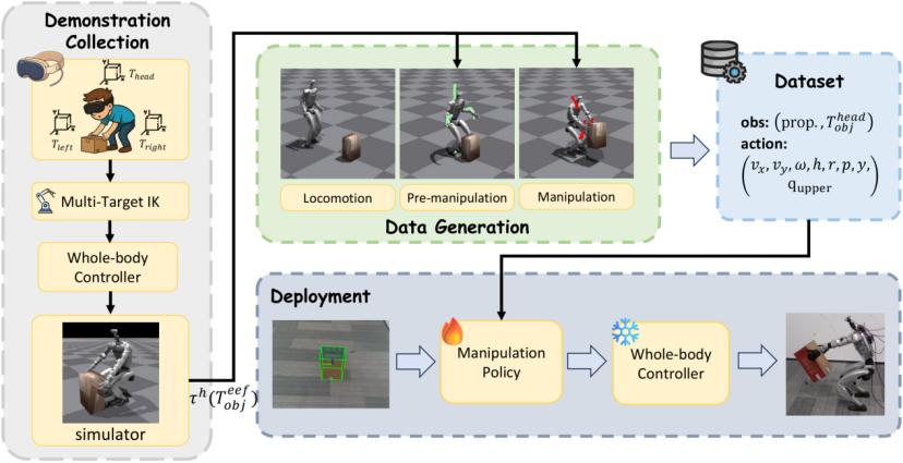 编辑丨 量子位 点击下方 卡片 ,关注" 具身智能之心 "公众号 >> 点击进入→ 具身 智能之心 技术交流群 更多干货,欢迎加入国内首个具身智能全栈学习社区: 具身智能之心知识星球(戳我) ,这里包含所有你想要的! 近日,来自北京大学与BeingBeyond的研究团队提出 DemoHLM 框架,为人形机器人移动操作(loco-manipulation)领域提供一种新思 路——仅需1次仿真环境中的人类演示,即可自动生成海量训练数据,实现真实人形机器人在多任务场景下的泛化操作,有效解决了传统方 法依赖硬编码、真实数据成本高、跨场景泛化差的核心痛点。 DemoHLM的核心创新在于"分层控制+单演示数据生成"双引擎,既保证了全身运动的稳定性,又实现了极低数据成本下的泛化学习。 分层控制架构:兼顾灵活性与稳定性 DemoHLM采用"低层全身控制器+高层操作策略"的分层设计,解耦"运动控制"与"任务决策": 此外,团队为机器人设计了 2DoF主动颈部+RGBD相机 (Intel RealSense D435),通过比例控制器实现"视觉追踪稳定",模仿人类操作 时的视线调节能力,避免物体遮挡导致的感知失效。 核心挑战:人 ...