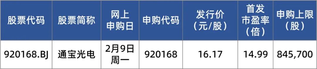 近期新股市场表现 - 本周2只新股上市首日平均涨幅为144.76%,其中北芯生命首日上涨183.33%,单签盈利超1.6万元[1] - 2025年北交所新股上市首日平均涨幅达368.13%,较2024年显著提升[4] - 截至2月8日,2026年共有5只北交所新股上市,首日平均涨幅接近200%[6] 市场展望与机构观点 - 机构认为资金交投活跃,结构性做多热情未显著衰竭,新股次新板块震荡活跃周期将继续演绎[1] - 春节前建议灵活积极择机,可跟随热点事件、把握主题轮动或高低切轮动节奏[1] - 西南证券展望2026年北交所新股市场,认为已受理及在审企业储备充足,为市场持续提供来自先进制造等领域的优质供给,新股常态化发行与高关注度有望延续[4] 下周申购新股:通宝光电 - 通宝光电将于2月9日(周一)申购,是春节前最后一个交易周唯一的北交所新股[1] - 公司发行价为16.17元/股,首发市盈率为14.99倍,申购上限为845,700股[2] - 公司被认定为国家级专精特新“小巨人”企业,定位于汽车电子零部件制造商[1][2] 通宝光电业务概况 - 公司主营业务为汽车照明系统、电子控制系统、能源管理系统等汽车电子零部件的研发、生产和销售[2] - 汽车照明系统为基石业务,产品已应用于上汽通用五菱、广汽埃安、广汽传祺、东风日产、上汽大众等品牌的多款热门车型[2] - 公司以技术创新为驱动,在汽车照明系统基础上不断探索汽车电子新业务板块[1] 通宝光电业务拓展与产品储备 - 公司积极向汽车电子控制系统、能源管理系统延伸,2022年EPS控制器研发成功并实现量产销售[2] - 2023年,公司首款充配电总成产品取得首批订单并于2024年实现量产[2] - 公司还有充电枪、车身域控制器等新产品储备[2] 通宝光电财务表现 - 2025年度,公司营业收入为7.17亿元,同比增长21.94%[3][4] - 2025年度,公司归属于母公司股东的净利润为8005.16万元,同比变动-3.66%[3][4] - 2025年度,公司扣除非经常性损益后归属于母公司股东的净利润为7929.78万元,同比下降2.22%[4]