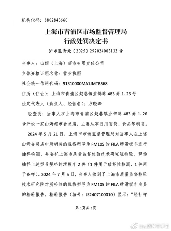 事件概述 - 上海市青浦区市场监督管理局对山姆(上海)超市有限责任公司连续发布两份行政处罚决定,涉及销售不符合国家标准的儿童产品 [1] 行政处罚详情(FILA滑板车) - 处罚决定书文号为沪市监青处﹝2025﹞292024003132号 [1][3][4] - 产品为规格型号FM105的FILA牌滑板车,抽检发现“用于包装或玩具中的塑料袋或塑料薄膜”项目不符合国家标准GB6675.12-2014,存在儿童窒息风险 [1][4] - 公司共购进该批次产品64件,销售61件,货值金额为12338元,违法所得为2616.9元 [1][4] - 处罚结果为没收违法所得0.261690万元、罚款0.616900万元、没收非法财物并责令停止违法行为 [1][4] 行政处罚详情(儿童三件套) - 处罚决定书文号为沪市监青处﹝2025﹞292024002803号 [2][4][5] - 产品为60支兰精天丝儿童三件套,抽检及复检均显示“印花面料耐摩擦色牢度”不符合GB31701-2015标准要求 [2][5] - 公司共购进该批次产品98件,销售12件,货值金额为22530.2元,违法所得为510.96元 [2][5] - 处罚结果为没收违法所得0.051096万元、罚款1.126510万元并责令停止违法行为 [2][4][5] 公司背景信息 - 山姆(上海)超市有限责任公司成立于2018年12月19日,法定代表人为郑硕怀 [3][6] - 公司注册资本为493.315万美元,是沃尔玛(中国)投资有限公司的全资子公司 [6] - 企业注册地址位于上海市青浦区赵巷镇业锦路483弄1-26号 [4][5][6] 处罚法律依据 - 两起案件的处罚均依据《中华人民共和国产品质量法》第四十九条、第五十五条、第六十条以及《上海市产品质量条例》第四十二条、第四十七条等规定 [4][5]