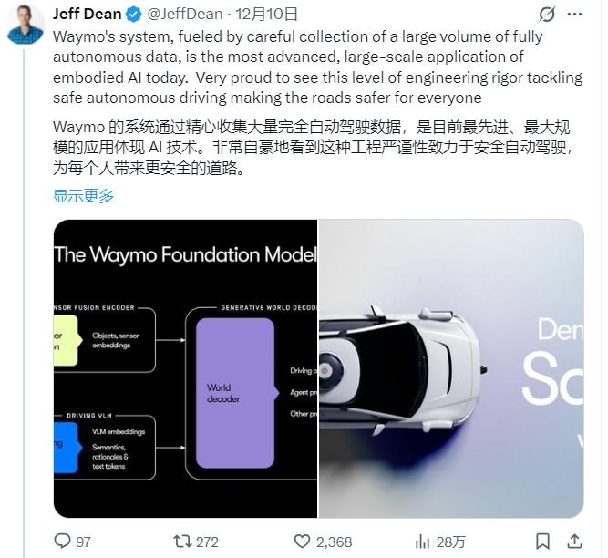 "Waymo从来没有真正与特斯拉抗衡的机会。" 这番大胆开麦,不用想也知道,来自一向"口无遮拦"的首富马斯克。 不过事出有因,他的回怼实际是因为谷歌DeepMind首席科学家发帖时,暗示特斯拉和Waymo相比,两家的Robotaxi还有差距。 借着这个档口,马斯克再度放话,3周内Robotaxi就会取消安全员——真正开始纯无人载客了。 马斯克回怼谷歌科学家:Waymo没机会抗衡 引得马斯克激情开麦的源头,来自谷歌DeepMind首席科学家、谷歌研究首席科学家、Gemini项目负责人杰夫·迪恩(Jeff Dean)在社交平台X上发的一篇 帖子。 这篇帖子原本是在展示谷歌旗下Waymo的基础模型。 这个模型通过融合端到端与模块化设计,构建了一个以"快速感知-深度推理"双系统为核心的世界模型架构: 系统1(快速反应):传感器融合编码器实时处理摄像头/激光雷达/雷达数据,生成物体、语义信息及嵌入向量,支持毫秒级驾驶决策; 系统2(深度推理):基于Gemini大模型的视觉语言模型(VLM),利用海量世界知识理解罕见场景(如车辆起火时主动绕行)。 两者共同输入世界解码器,生成高精度轨迹预测与安全验证信号。 原本只是一个简 ...