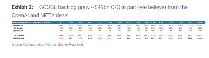 核心观点 - 摩根士丹利报告认为,Alphabet在最新财报季中凭借全面超预期的业绩表现,在战术上超越Meta [2] - 谷歌云业务的爆发式增长是主要亮点,推动其盈利预测被显著上调 [2][4] - Meta因资本支出与运营成本走高,引发市场对其投资回报率的担忧,导致盈利预测被下调 [2][7] - 长期竞争格局取决于下一代AI模型的突破,谷歌的Gemini 3与Meta的Llama模型是关键 [3][10] 公司业绩与市场反应 - 谷歌所有主要收入线均实现超预期增长:搜索业务同比增长14.5%,YouTube增长15%,谷歌云同比增长34% [2] - 摩根士丹利将Alphabet目标价从270美元上调至330美元,并将2026/27财年每股收益预测分别上调约7%和9% [2] - Meta第四季度收入指引未能提振市场信心,摩根士丹利将其目标价从850美元微降至820美元,并对2026/27财年每股收益预测分别下调5%和4% [2] 谷歌云业务表现 - 谷歌云积压订单季度环比飙升46%,增加约490亿美元,总额达到1550亿美元 [4] - 增长部分可能首次计入来自OpenAI和Meta的订单 [4] - 谷歌今年迄今签订的超过10亿美元合同数量已超过过去两年总和 [5] - 预计从与Anthropic新宣布的合同中获得500亿至800亿美元的增量收入 [5] - 摩根士丹利将谷歌云部门2026年和2027年的收入预测分别上调9%和13% [5] 估值分析 - Alphabet基础情景目标价为330美元,隐含上涨空间13%,隐含2027年市盈率为24.8倍 [6] - Meta基础情景目标价为820美元,隐含上涨空间16%,隐含2026年市盈率为26倍,2027年市盈率为23倍 [8] - 盈利预期的上调对于驱动阶段性股价表现至关重要 [8] 投资与回报不确定性 - Meta的运营支出和资本支出因其对“超级智能团队”的投入而上升,是2026年资本支出同比增加的最大驱动因素 [7] - 尽管Facebook和Instagram的用户时长等核心指标依然强劲,但高昂的投资引发市场对其投资回报率的疑虑 [7] - 这种不确定性可能对Meta的股票估值构成压力或设置上限 [7] 长期竞争与下一代AI模型 - 决定两家公司长期竞争地位和估值倍数的,将是其下一代AI模型的能力 [10] - 谷歌的下一个关键催化剂是预计在年底前发布的Gemini 3,市场将关注其在推理、扩散能力和代理功能等方面的表现 [10] - Meta的真正考验在2026年,其“超级智能团队”需要推出具备领先和独特性质的Llama推理或下一代前沿模型 [10] - 盈利修正以及对AI投资回报的信心,将是决定两家公司在2026年股价表现及相对估值的关键 [9]