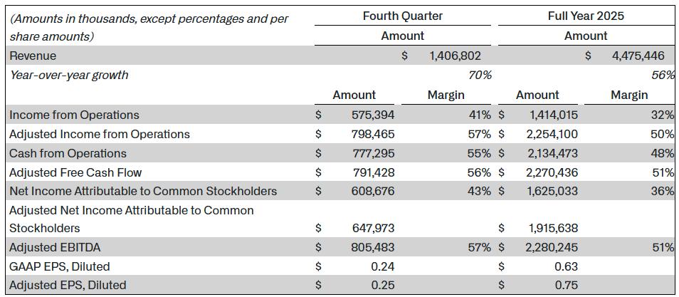核心观点 - 公司第四季度及2025全年业绩全面超出市场预期 营收、利润及关键部门收入均实现强劲增长 并发布了显著高于市场预期的2026财年指引 带动股价盘后大幅上涨[1][3] 财务业绩 - 第四季度营收达14.1亿美元 同比增长70% 超出分析师预期的13.3亿美元[1] - 第四季度调整后每股收益为0.25美元 超出分析师预期的0.23美元[1] - 2025年全年营收为44.75亿美元 同比增长56%[2] - 第四季度运营利润为5.75亿美元 运营利润率达41% 调整后运营利润为7.98亿美元 利润率达57%[2] - 2025年全年运营利润为14.14亿美元 运营利润率达32% 调整后运营利润为22.54亿美元 利润率达50%[2] - 2025年全年归属于普通股股东的净利润为16.25亿美元[3] - 第四季度经营活动现金流为7.77亿美元 占营收的55% 调整后自由现金流为7.91亿美元 占营收的56%[2] - 2025年全年经营活动现金流为21.34亿美元 占营收的48% 调整后自由现金流为22.70亿美元 占营收的51%[2] 收入构成与客户合同 - 第四季度美国政府部门贡献收入5.7亿美元 超过分析师预期[1] - 第四季度商业部门贡献收入5.07亿美元 超过分析师预期[1] - 2025年美国市场营收同比增长75% 达到33.2亿美元[3] - 第四季度完成了180笔单笔金额至少为100万美元的交易 84笔500万美元以上的交易以及61笔1000万美元以上的交易[3] - 美国商业剩余交易额同比增长145% 达到43.8亿美元[3] 业绩指引 - 预计2026年第一季度营收在15.32亿美元至15.36亿美元之间 显著高于分析师们预期的13.2亿美元[3] - 预计2026财年总营收将达到71.82亿美元至71.98亿美元 较2025年增长超60%[3] 市场与业务动态 - 美国政府持续采用公司工具 该部门收入实现了66%的增长[4] - 公司产品需求非常强劲 已暂停向美国盟友国家出售新产品 主要需求来自于美国国防部[4] - 公司与美国陆军签署了一份价值高达100亿美元的合同 以满足其软件和数据需求[4] - 公司与美国海军签署了一项价值4.48亿美元的协议 以加快造船生产[4] - 公司专注于为政府与商业客户提供定制化AI平台 核心产品包括面向政府领域的Gotham和商业领域的Foundry[2]