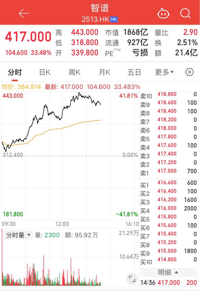AI大模型第一股智谱盘中涨超41%,市值超1900亿港元