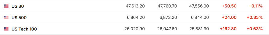 2. 截至发稿,德国DAX指数涨1.09%,英国富时100指数涨0.06%,法国CAC40指数涨0.06%,欧洲斯托克50指数涨0.57%。 | 德国DAX30 | 24,215.84 | 24,261.84 | 23,968.50 | +261.39 | +1.09% | | --- | --- | --- | --- | --- | --- | | 英国富时100 | 9,722.80 | 9,742.00 | 9,717.15 | +5.55 | +0.06% | | 法国CAC40 | 8,126.32 | 8,151.00 | 8,097.35 | +5.25 | +0.06% | | □ 欧洲斯托克50 | 5,694.05 | 5,705.60 | 5,656.35 | +32.01 | +0.57% | 盘前市场动向 1. 11月3日(周一)美股盘前,美股三大股指期货齐涨。截至发稿,道指期货涨0.11%,标普500指数期货涨0.35%,纳指期货涨 0.63%。 | = US 30 | 47,613.20 | 47,760.70 | 47,556.00 | +50.50 | +0.11% | | ...
