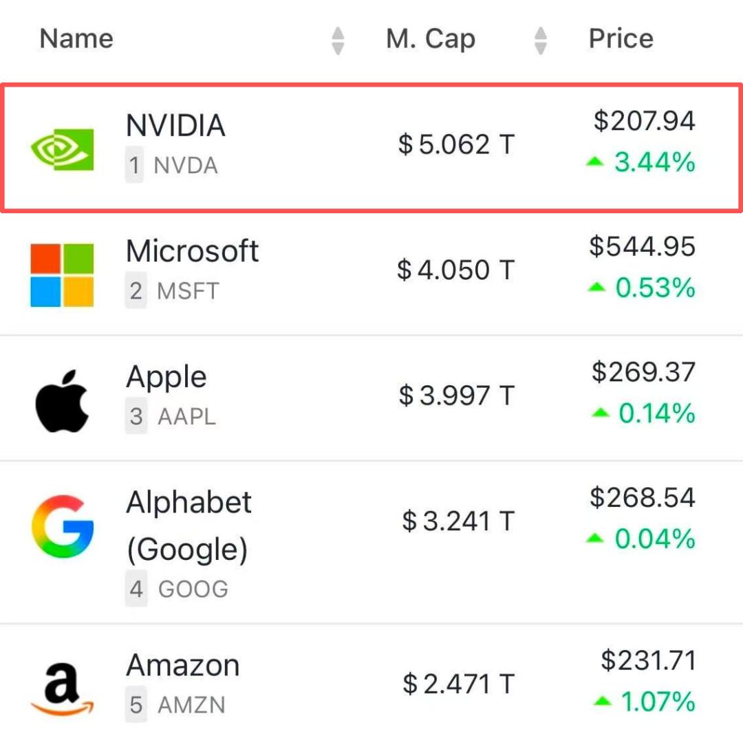编辑:定慧 好困 【导读】 就在刚刚, 英伟达市值突破5万亿美元,成为全球首家实现这一里程碑的公司。如今, 它的市值已超越德国和日本的GDP,堪称「全球第三大经济体」。 今夜,英伟达再次创造历史! 受GTC大会的影响,英伟达股价上涨4.15%,成为首家市值突破5万亿美元的公司! 这是一个前所未有的里程碑,不仅是英伟达,不仅是GPU芯片,更是AI时代的里程碑。 | Name | | M. Cap | ID | Price | | --- | --- | --- | --- | --- | | | NVIDIA | $ 5.062 T | | $207.94 | | | 1 NVDA | | | - 3.44% | | | Microsoft | $ 4.050 T | | $544.95 | | | 2 MSFT | | | - 0.53% | | | Apple | $ 3.997 T | | $269.37 | | | 3 AAPL | | | - 0.14% | | | Alphabet | $ 3.241 T | | $268.54 | | | (Google) | | | - 0.04% | | | ...