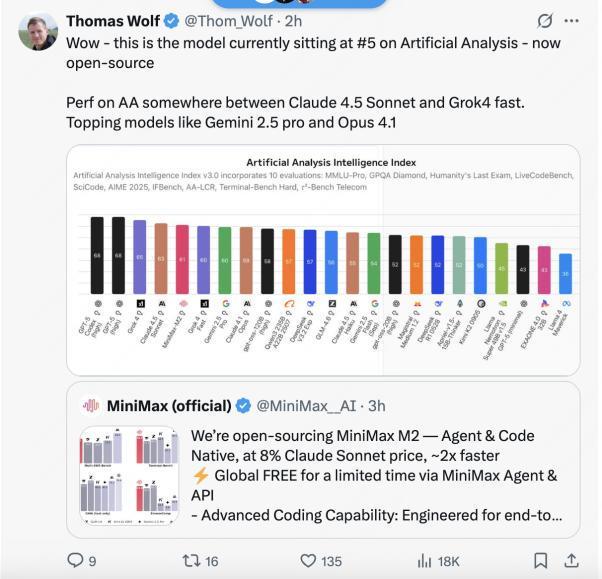 模型发布与核心性能 - 中国AI公司MiniMax于2025年10月27日正式发布并开源新一代文本大模型MiniMax-M2 [1] - 该模型采用混合专家架构,总参数为2300亿,激活参数为100亿,是一款轻量级模型 [1][13] - 在行业测评榜单Artificial Analysis上,M2模型总分冲入全球前五,在开源模型中排名第一,超越了谷歌的Gemini 2.5 Pro和Anthropic的Claude 4.1等模型 [1][15] 技术能力与基准测试表现 - 模型专为编码和智能体任务深度优化,具备强大的端到端开发能力,能够处理多代码文件并执行完整的“编码-运行-调试”循环 [20][21] - 在Xbench-DeepSearch基准测试中,M2的深度搜索能力位列全球前二,仅次于GPT-5 [21] - 在字节推出的金融搜索基准FinSearchComp-global上,M2同样位列全球前二,仅次于Grok-4 [21] - 在Reddit社区分享的基准测试中,M2获得了58.3%的分数 [8][19] 成本效率与市场反响 - M2的API服务定价为每百万Token输入0.3美元,输出1.2美元,综合成本不到Claude 4.5 Sonnet的8% [1][6][22] - 在OpenRouter平台上线不到两天,模型调用量已跻身全球前10 [22] - 海外开发者如CoreViewHQ联合创始人兼CTO Ivan Fioravant测试后评价模型表现出色,甚至优于Claude 4.1 Opus [8][10] 行业影响与算法创新 - M2的发布被视为中国AI实验室在开源领域领先地位的延续,继DeepSeek、阿里巴巴、Z AI和Moonshot AI之后 [1][6] - Meta在其最新的强化学习论文《The Art of Scaling Reinforcement Learning Compute for LLMs》中,大规模验证并采用了MiniMax原创的CISPO损失函数和FP32 Head技术 [26] - 论文指出MiniMax的CISPO算法在效率上显著高于现有的DAPO算法,并将MiniMax列为推动大规模强化学习ScaleRL突破的关键 [26]